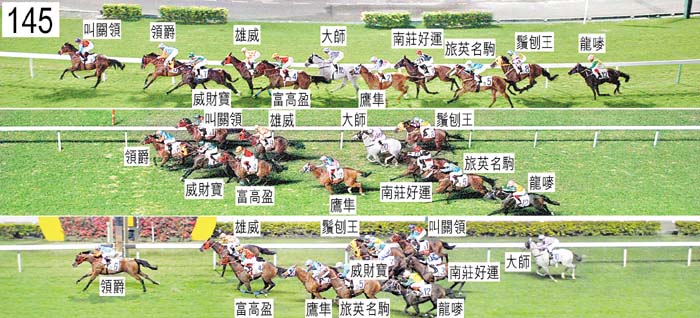 「領爵」四平八穩,無大起落。「雄威」火氣普通,未覺再進。「富高盈」前腳紮高,神態旺盛。「鷹隼」毛水均勻,長期偏肥。「旅英名駒」雙眼有神,身色俱佳。「鬚刨王」毛水油潤,火氣上揚。「龍嘜」細馬不瘦,火氣續增。「威財寶」神態活躍,作戰水準。「南莊好運」行圈有力,收身更靚。「叫關領」馬身粗壯,色澤油潤。「大師」收身已足,觀感勝前。「良友之寶」行圈呈急,身可更實。