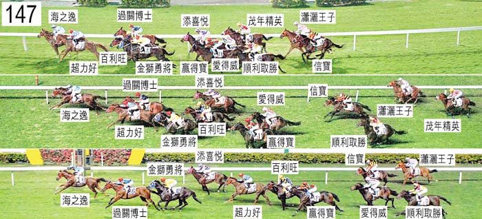 「海之逸」行圈步密,身形標準。「過關博士」肌肉飽滿,毛水均勻。「金獅勇將」躍躍欲試,神態甚生。「添喜悅」馬身實淨,火氣普通。「超力好」毛水轉深,觀感勝前。「百利旺」雙目有神,毛水烏潤。「贏得寶」前腳紮高,火氣上揚。「愛得威」毛水立令,長期見勇。「信寶」身實如鐵,老當益壯。「順利取勝」行圈步順,有點起色。「瀟灑王子」兩個人拖,有火有力。「茂年精英」紮齊四腳,精神奕奕。