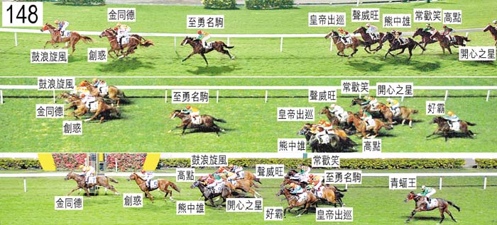 離開跑馬地馬場的馬房前,「好霸」被發現失右前蹄的蹄鐵,重新裝上後由獸醫檢查,獸醫認為適宜出賽。躍出時,見習騎師王志偉的臉被「開心之星」的頭撞到,當時「開心之星」出閘笨拙並且昂首。「開心之星」因而失地。「青蝠王」出閘緩慢,其後被「好霸」碰撞時失去平衡。「至勇名駒」自外檔出閘後於早段及中段在外疊競跑,沒有遮擋。轉直路彎時,「聲威旺」在「皇帝出巡」內側受擠迫,當時「皇帝出巡」將頭轉側並且內閃。入直路後不久,「熊中雄」(冼毅力)被「皇帝出巡」(見習騎師徐君禮)碰撞,當時「皇帝出巡」向外斜跑。見習騎師徐君禮解釋,坐騎一直內閃,為了嘗試阻止坐騎斜跑,他收緊左邊韁繩以將坐騎的頭轉向外側,因此他抬起左手手肘。見習騎師徐君禮將左手手肘抬起,因而觸碰冼毅力的身體,被小組嚴厲譴責。過了二百米處,「聲威旺」將頭轉側並且內閃避開「高點」,當時「高點」在其外側推進。見習騎師楊啟棠(「鼓浪旋風」)解釋,坐騎帶頭後搶口,不肯放鬆來跑,因而跑來步速較他所願快。韋達(「高點」)解釋,轉直路彎時,他跟隨「熊中雄」。他說,當「熊中雄」於入直路時向外移出時,他選擇在「皇帝出巡」內側收慢,並且在「皇帝出巡」與「聲威旺」之間推進。他說,接近二百五十米處,「高點」將頭轉側,在「聲威旺」後蹄外側一度處於窘境,因此在一段短途程上他未能開始力策坐騎。「皇帝出巡」及「聲威旺」均須接受獸醫檢查,賽後獸醫檢查這兩駒,並無發現任何明顯異常之處。「金同德」及「創惑」均須接受抽樣檢驗。賽後,獸醫報告,「好霸」及「開心之星」均失去左前蹄的蹄鐵。