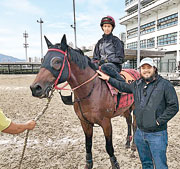 馬主之一馮尚仁上年底入沈廐探班,並與羅理雅操練完的「高時運」合照。(Aquis Farm Facebook圖片)
