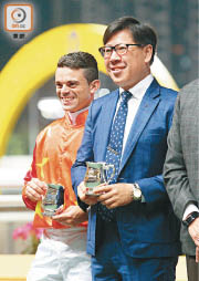 葉楚航(右)孖李寶利捧盃,練騎兩人均笑得相當開懷。