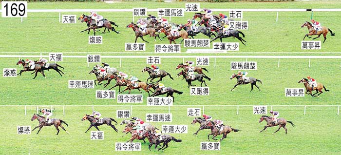 「走石」在閘內站立差劣,出閘笨拙,因而失地。出閘時,「萬事昇」被「光速」碰撞,當時「光速」向外斜跑。八百米處轉彎時,「幸運馬迷」在「贏多寶」後蹄內側處於窘境。同樣於八百米處轉彎時,「萬事昇」將頭轉側,向外斜跑,並且收慢以避開「幸運大少」的後蹄。過了七百米處,「駿馬翹楚」一度收慢以避開「贏多寶」的後蹄。過了二百米處,「燦惑」將頭轉側,向著內側的「天福」斜跑。戴勝(「贏多寶」)說,賽前他認為該駒會領放,並且預計「銀鑽」與「燦惑」均會上前與他並跑。他說,出閘明顯最快的「天福」,在早段速度快過「贏多寶」並且開始切入。他說,由於賽前他獲指示須確保在直路上離開內欄衝刺,於是他讓「天福」切入,這樣他便能夠繼續離開內欄競跑。他說,八百米處轉彎時,「贏多寶」開始外閃並且低俯,在是日的場地上走勢十分不暢順。他說,此後「贏多寶」繼續外閃,末段未能以勁勢衝刺,他認為這完全是因為該駒未能應付是日的場地。「贏多寶」須接受獸醫檢驗及抽樣檢驗,賽後該駒由獸醫檢驗,並無發現異常之處。「燦惑」與「天福」均須接受抽樣檢驗。賽後,「幸運大少」被發現失去左前蹄的蹄鐵。