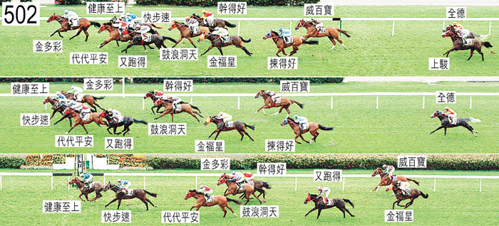 「揀得好」出閘笨拙。起步後不久,「全德」在「快步速」與「上駿」之間受擠迫時勒避,當時「快步速」被「金福星」帶向內跑,「上駿」則被「鼓浪洞天」帶向外跑。「幹得好」增速緩慢。躍出時,「威百寶」低俯。八百米處轉彎時,「上駿」外閃並且勒避「揀得好」的後蹄,跟隨在後的「全德」因而勒避。在這宗事件之後,「上駿」繼續嚴重地外閃,在直路上收慢。賽後,「上駿」被發現流鼻血。接近七百米處,被「金多彩」越過後,「快步速」不願保持其位置並且失地。跟隨「快步速」的「健康至上」勒避該駒的後蹄,「幹得好」相應勒避「健康至上」的後蹄。其後不久,已移至「健康至上」外側的「幹得好」,在「健康至上」與「鼓浪洞天」之間受擠迫時勒避,當時「鼓浪洞天」被「金福星」帶向內跑,「金福星」本身則在「又跑得」(杜利萊)後蹄內側受擠迫並且收慢,當時「又跑得」略為向內斜跑。小組認為此宗事件與「幹得好」較早前受到的妨礙有一定關係,因此不採取行動,但告誡杜利萊在任何時候均須小心。將到終點時,「幹得好」被「金多彩」挨擦,當時「金多彩」向外斜跑。「又跑得」沿途在外疊競跑,沒有遮擋。杜利萊(「又跑得」)說,該駒自外檔出閘後未能獲得遮擋,直路上反應僅屬一般,在終點前大約五十米開始墮退並且動作失去平衡,因此他沒有如常地力策坐騎至終點。馬安東(「揀得好」)說,沿途他在領放馬之後走勢暢順,儘管走第四疊,但一直獲得遮擋,他期待坐騎將以勁勢衝刺,然而,入直路後催策時,坐騎並無反應。他未能就該駒的差劣表現提供任何解釋。「揀得好」須接受獸醫檢驗,賽後該駒由獸醫檢驗,獸醫說該駒咳嗽,內窺鏡檢查顯示該駒氣管內有很多血。「揀得好」必須通過獸醫檢驗後,才可再次出賽。「代代平安」、「健康至上」以及「快步速」均須接受抽樣檢驗。