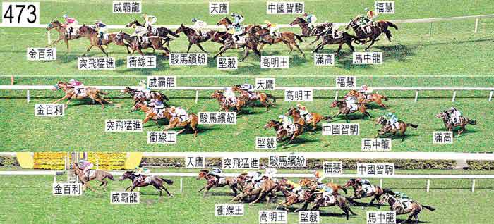 「威霸龍」及「高明王」均出閘緩慢。「駿馬繽紛」起步時向上跳躍,因而失地。「福慧」自外檔出閘緩慢,繼而在馬群後面切入。起步後不久,「高明王」在斜跑的「威霸龍」與「駿馬繽紛」之間受擠迫。由於此宗擠迫事件,三駒均因而失去平衡。接近千一米處,「高明王」收慢避開「威霸龍」的後蹄。「福慧」在接近一千米處轉彎時走勢笨拙,其後在轉直路彎時在「馬中龍」內側處於窘境。接近八百米處,「駿馬繽紛」收慢避開「衝線王」的後蹄,當時「衝線王」略為向內斜跑。其後,「衝線王」持續在外疊競跑,沒有遮擋。二百五十米處,「馬中龍」向外移出避開「高明王」的後蹄。接近一百米處,衝刺普通的「福慧」,收慢並且向外移出避開「駿馬繽紛」的後蹄。其後,「福慧」未能望空,因而未能全力施為。在最後階段,「威霸龍」內閃。奔向終點時,「駿馬繽紛」在「突飛猛進」內側及「天鷹」後蹄外側處於窘境。「駿馬繽紛」因而沒有被力策至終點。小組告誡跑第四名的見習騎師楊啟棠(「衝線王」),只要情況許可,他必須確保至少手足並用力策坐騎至終點。「福慧」須接受獸醫檢查,賽後獸醫檢查該駒,並無發現任何明顯異常之處。「金百利」及「威霸龍」均須接受抽樣檢驗。賽後,「突飛猛進」被發現失去左後蹄的蹄鐵。
