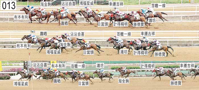被查詢時,見習騎師徐君禮(「日當頭」)說,首次跑過終點柱後,他曾考慮切入至「有本有利」外側,然而在他後面內側的「淘金駒」之騎師當時大聲呼叫,他相信,若然他於此時移入,可能會對「淘金駒」造成干擾,因此他於首個彎位時繼續在第四疊競跑。他說,進入對面直路時,「日當頭」能夠切入至第三疊,但持續沒有遮擋。觀看賽事影片後,見習騎師徐君禮承認,在早段他已足夠帶離「淘金駒」以向內移入。小組告誡他,在情況許可下,他應採用避免坐騎多跑腳程的方式策騎。被查詢有關於過了六百米處的騎法時,見習騎師黎海榮(「首瞻一線」)說,原本打算讓坐騎在外疊競跑。他說,起初他不認為於六百米處有機會讓坐騎移離內欄,因此他繼續貼欄競跑。他說,轉直路彎時,「濰坊」在他外側上前,令他未能移離內欄,他選擇不上前,寧願等待機會向外移出。他說,入直路後不久,顯而易見「濰坊」會繼續在他外側,因此他於內檔在馬群之間推進。觀看賽事影片後,見習騎師黎海榮承認,六百米處有一個機會讓他移離內欄。小組告誡見習騎師黎海榮,他自六百米處的騎法已引起小組關注,他應時刻把握現成的機會以改善位置,尤其是在賽事的重要階段。「有本有利」、「鴻福星威」以及「沾沾自喜」均須接受抽樣檢驗。