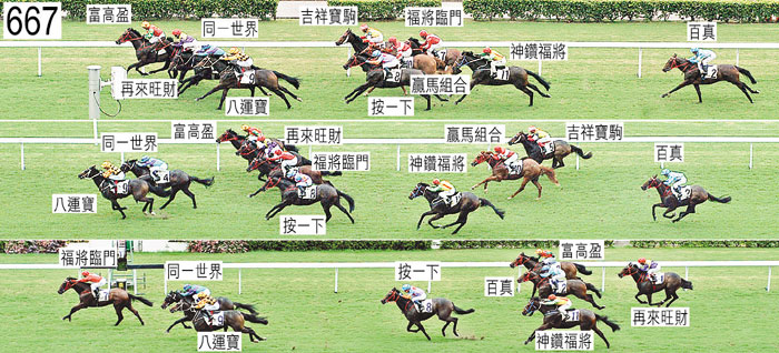 「神鑽福將」出閘笨拙。「京城天寶」及「福將臨門」均出閘緩慢。接近千一米處,「百真」在「按一下」(冼毅力)內側受擠迫時收慢,當時「按一下」向內斜跑。小組告誡冼毅力必須小心。接近八百米處,跑來搶口的「贏馬組合」,收慢避開「再來旺財」後蹄時昂首,當時「再來旺財」在僅僅帶離時向內斜跑。考慮了有關情況,小組不採取行動。其後,「贏馬組合」持續搶口,收慢避開「同一世界」後蹄。「八運寶」沿途在外疊競跑,沒有遮擋,中段及直路早段外閃。過了四百米處,「神鑽福將」收慢並且移至「按一下」外側望空。在末段,「百真」內閃。「八運寶」、「福將臨門」以及「同一世界」均須接受抽樣檢驗。