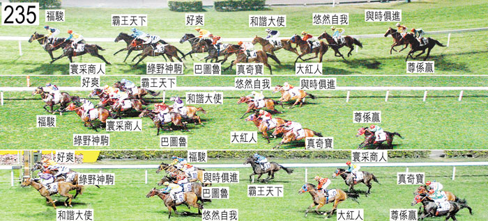 「悠然自我」站立姿勢差劣,出閘緩慢。「和諧大使」出閘緩慢,繼而收慢避開「巴圖魯」後蹄,當時「巴圖魯」向外斜跑。「真奇寶」出閘緩慢,其後沿途在外疊競跑,沒有遮擋。接近九百米處,「和諧大使」在「好爽」與「巴圖魯」之間處於窘境時走勢稚嫩之際失去平衡並且失地,當時「巴圖魯」略為向內斜跑。跟隨「巴圖魯」的「大紅人」受到妨礙。八百米處,「和諧大使」移入至一個內欄位置,跟隨其後的「悠然自我」一度收慢。六百米處轉彎時及五百米處,「霸王天下」兩度失去平衡並且碰撞內欄。過了六百米處,「巴圖魯」在「好爽」與「真奇寶」之間受擠迫時失去平衡。趨近二百米處,難以望空的「好爽」,收慢並且移至「福駿」外側以上前。過了二百米處,「悠然自我」移出更外疊以望空。「和諧大使」及「好爽」均須接受抽樣檢驗。賽後,「霸王天下」被發現左前蹄球節有一處割傷。