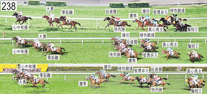 「心中有運」前腳紮高,行圈呈急。「大勇」毛水立令,馬如其名。「零距離」神態集中,文靜乖巧。「鷹隼」已算收身,稍欠鋒利,紮後蹄。「濰坊」行圈步爽,依然吸引。「綠色駿達」精神奕奕,皮光肉潤,馬頗多汗。「智勇非凡」馬身實淨,神態旺盛,肚底有汗。「快而勝」毛水更潤,狀態更進,火可更旺。「投資寶」火氣上揚,身形頗靚。「鬚刨王」毛水均勻,外觀吸引。「真心馬主」馬身略收,色澤均勻。