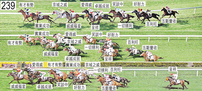 「好耐力」出閘緩慢。「笑談中」出閘緩慢,其後勒避「愛得威」時失地更多,當時「愛得威」於躍出時向外斜跑。出閘後不久,「一切順利」在「愛得威」與「京城之威」之間受擠迫。接近千三米處,「愛得威」及「卓越成就」均在「威威福星」內側受擠迫,當時「威威福星」一度向內斜跑。二百五十米處,「笑談中」在「愛得威」內側無路可上時向外移出。過了二百米處,「百利旺」在「一切順利」與「呈祥」之間無路可上時收慢並且向內移入,當時「呈祥」正在墮退。接近一百米處,「愛得威」企圖噬咬「有才有勢」。由於「愛得威」的練馬師薛達志已離開馬場,小組將於十二月十五日星期六的沙田賽事就此宗事件召見他。就在終點前,「實業成功」在「笑談中」與「有才有勢」之間處於窘境時收慢,當時「有才有勢」起初被「愛得威」帶出更外疊,繼而自己進一步斜跑。「實業成功」因而沒有如常地被力策至終點。「呈祥」沿途在外疊競跑,沒有遮擋。韋達(「一切順利」)未能就該駒的差劣表現提供解釋。他說,坐騎在早段及中段均走勢暢順,但過了七百米處當他試圖改善位置時不願展步。他說,直路上「一切順利」保持同速,在末段墮退。「一切順利」須接受獸醫檢查,賽後獸醫檢查該駒,並無發現任何明顯異常之處。「笑談中」、「威威福星」以及「愛得威」均須接受抽樣檢驗。