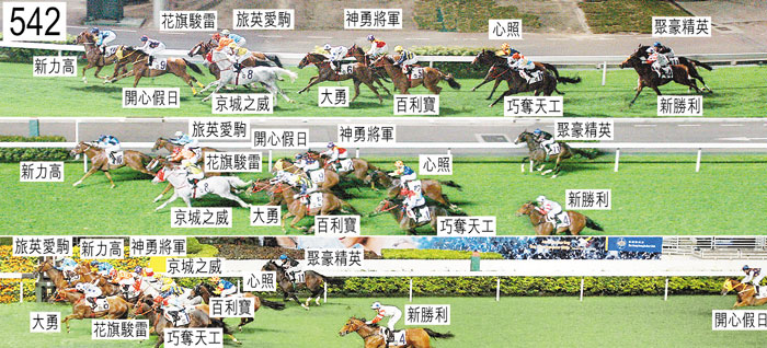 「巧奪天工」出閘緩慢。「心照」出閘笨拙,因而失地,其後接近千一米處收慢避開「新勝利」後蹄。「新勝利」儘管在早段被一路催策,但仍未能加速。「聚豪精英」自外檔出閘後在早段留後。一千米處轉彎時及在對面直路上,「神勇將軍」十分難以穩定走勢,趨近九百米處先靠近「花旗駿雷」後蹄,繼而靠近「旅英愛駒」後蹄處於窘境時勒避。六百米處轉彎時,「京城之威」在沒有遮擋下競跑。同樣在六百米處轉彎時,在「百利寶」內側緊迫競跑時被碰撞的「心照」,在「百利寶」與「神勇將軍」之間處於窘境時勒避,當時「百利寶」將頭轉側並且內閃,而「神勇將軍」在「大勇」內側一度受擠迫時收慢。小組不採取行動。跟隨其後的「新勝利」因而收慢。「新勝利」須接受獸醫檢查,賽後獸醫檢查該駒,並無發現任何明顯異常之處。「新力高」、「旅英愛駒」以及「大勇」均須接受抽樣檢驗。
