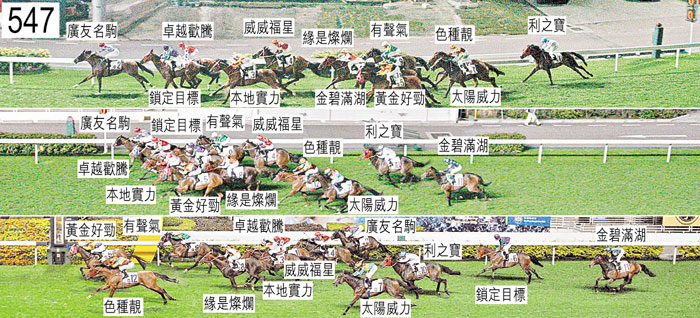 躍出時,「色種靚」與「緣是燦爛」互相碰撞。千三米處,「金碧滿湖」及「利之寶」均被「黃金好勁」阻礙及帶出更外疊,當時「黃金好勁」在難以穩定走勢時收慢之際向外斜跑。其後,「金碧滿湖」在餘下途程上在外疊競跑,沒有遮擋。自入直路及至過了二百米處,「有聲氣」受困,未能望空。入直路後在一段不短的途程上,「威威福星」難以望空。二百五十米處,「色種靚」移出更外疊望空。二百米處,「緣是燦爛」將頭轉側,向內斜跑,並且收慢避開「本地實力」後蹄,當時「本地實力」向外斜跑。薄奇能(「鎖定目標」)說,原本打算自大外檔出閘後盡可能將坐騎置於有遮擋的第四或第五位。他說,「鎖定目標」出閘僅屬普通,他隨即一路催策以圖執行策騎指示,但內側有數駒均被催策上前。他說,過了千六米處在外疊競跑時,他考慮收慢「鎖定目標」留至馬群後面,但他留意到會繼續被頂在外疊,因此他一路催策「鎖定目標」,希望在首次趨近終點柱時馬群會開始散開,讓他有機會居於領放馬後面。他說,一排馬匹繼續在他內側競跑,因此在首次跑過終點柱後他在領放馬外側的第五疊競跑。他說,過了千二米處當「廣友名駒」上前切內欄帶頭時,他選擇令坐騎上前,切入居於該駒外側。他說,由於在早段需要消耗坐騎氣力,坐騎在直路上墮退。湯智傑(「太陽威力」)解釋,由於是晚的場地似乎適合居於前列的馬匹,他獲指示自外檔出閘後上前,嘗試佔取一個有遮擋的位置。他說,數駒在早段上前,「太陽威力」未能帶離內側這些馬匹,因而在外疊競跑。他說,因此在接近千三米處他將坐騎留後,以圖佔取一個有遮擋的位置,但未能做到。「本地實力」、「黃金好勁」以及「色種靚」均須接受抽樣檢驗。