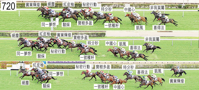 「絕塵」精神奕奕,皮光肉滑,身肥多少。「紅皮柚」火氣一般,稍遜勝時。「駿綵」前胸有汗,欠進步感。「同一夢想」四平八穩,近仗水準。「秘密行動」毛水均勻,但稍欠勢。「寶樹多盈」神態欠旺,身重多少。「一號種籽」保持茁壯,勇況未減。「中國心」步姿欠順,兩個人拖,色立令。「時分秒」曾經剪毛,小休活潑。「喜得法」過步順暢,火氣平平。「凱風」雙目有神,神態活潑。「實業輝煌」汗濕不少,氣勢平淡。「非我莫屬」比前乖巧,身無再瘦。