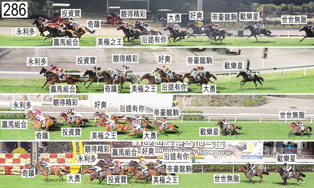 「世世無敵」及「好爽」均出閘緩慢。「帝豪龍駒」在閘內煩躁不安,自大外檔躍出時被留後。在早段及中段,「贏馬組合」在外疊競跑,沒有遮擋,其後被一路催策上前帶離馬群,並且移近內欄。「永利多」接近一千米處轉彎時走勢笨拙,斜跑出更外疊。進入對面直路後不久,「世世無敵」急促向內斜跑時失去平衡。過了四百米處,「沿途有你」在「好爽」與「美極之王」之間處於窘境時失去平衡。四百米處前,「投資寶」試圖在「永利多」與「贏馬組合」之間推進時無路可上後收慢。跟隨在後的「靚得精彩」因而收慢。自入直路後不久及至過了二百米處,「投資寶」難以望空,其後在接近五十米處被杜利萊(「贏馬組合」)的馬鞭擊中鼻部。在大約最後一百五十米,正以勁勢衝刺的「帝豪龍駒」未能望空,因而未能施為。在大約最後一百米,「沿途有你」未能望空,因而未有如常地被力策至終點。在大約最後五十米,「好爽」未能望空,因而未有如常被力策至終點。梁明偉(「歡樂星」)報告,是晚首次在跑馬地出賽的坐騎入閘後煩躁不安,出閘笨拙,昂首,因而在早段未能加速。「靚得精彩」須接受獸醫檢查,賽後獸醫檢查該駒,並無發現任何明顯異常之處。「帝豪龍駒」、「奇蹟」及「大勇」均須接受抽樣檢驗。