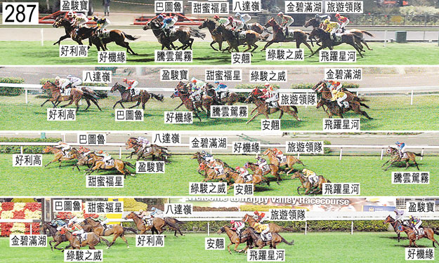 入閘後,「盈駿寶」煩躁不安,起初試圖從閘廂前門下面衝出,繼而坐後。「盈駿寶」被牽出閘廂由獸醫檢查,獸醫認為適宜出賽。當「盈駿寶」煩躁不安時,騎師楊啟棠的左腳被夾在閘廂內,令他覺得不適。當「盈駿寶」接受獸醫檢查時,楊啟棠腳部不適消退,他說他能夠策騎該駒。「盈駿寶」必須經閘廂測試及格後,才可再次出賽。「巴圖魯」在閘內亦十分煩躁不安,出閘笨拙,失蹄,向外斜跑,碰撞「甜蜜福星」。「巴圖魯」必須經閘廂測試及格後,才可再次出賽。「旅遊領隊」出閘笨拙,被「八達嶺」碰撞後失地。過了千二米處,「好機緣」在外疊競跑,沒有遮擋。進入對面直路後,「好機緣」被「騰雲駕霧」帶出更外疊,當時「騰雲駕霧」本身收慢並且被「好利高」帶出更外疊,而「好利高」被「盈駿寶」過頭後開始搶口並且向外斜跑。趨近四百米處,「八達嶺」及「甜蜜福星」均在「騰雲駕霧」內側受緊迫,當時「騰雲駕霧」開始墮退。三百五十米處,持續墮退的「騰雲駕霧」,在「甜蜜福星」與「好機緣」之間處於窘境時勒避。當「騰雲駕霧」勒避時,跟隨其後的「綠駿之威」及「旅遊領隊」均勒避並且向外移出以避開該駒後蹄。在最後二百米,「飛躍星河」內閃,難以催策。被查詢時,賴維銘(「好利高」)說,他獲指示一如上仗般將坐騎置於包廂位置。他說,「好利高」出閘迅速,他讓坐騎上前,切入至內欄,繼而嘗試收慢坐騎。他說,此時坐騎開始搶口。他說,賽事步速僅屬中等,跑過千一米處,他繼續收慢「好利高」以讓「盈駿寶」上前,切入內欄,為他提供遮擋,「盈駿寶」於進入對面直路時做到。他說,坐騎起初令他覺得在遮擋下會放鬆來跑,但其後不久開始搶口,靠近「盈駿寶」後蹄,因此他移至「盈駿寶」外側。潘頓(「騰雲駕霧」)說,他獲指示盡可能將坐騎置於領放馬後面有遮擋的位置。他說,「騰雲駕霧」上仗一放到底勝出。他說,「騰雲駕霧」的練馬師約翰摩亞告知他,覺得是晚的步速可能較「騰雲駕霧」上仗快,「騰雲駕霧」增程角逐1800米兼比上仗多負十磅,假如催策該駒上前帶頭,末段可能衝刺乏力。他說,早段他依照策騎指示上前,覺得早段步速快。他說,早段他必須消耗「騰雲駕霧」一些氣力以超越內側的馬匹,其後他察覺「巴圖魯」被力策以保持內欄位置。他說,當「好利高」切入帶頭時,他立即收慢坐騎以保持在「巴圖魯」外側。他說,當「盈駿寶」於過了千二米處上前領先時,他曾考慮讓坐騎上前,居於「好利高」外側,但他發覺該駒開始搶口,覺得該駒會移離內欄,從而令他被迫走第三疊。他說,因此進入對面直路後當「好利高」移離內欄時,他讓該駒上前,選擇跟隨領放馬匹,以避免走外疊沒有遮擋。「騰雲駕霧」須接受獸醫檢查及抽樣檢驗,賽後獸醫檢查該駒,發現該駒心律不正常。「騰雲駕霧」必須試閘及格,並且通過獸醫檢驗後,才可再次出賽。「盈駿寶」及「好機緣」均須接受獸醫檢查。賽後獸醫檢查「盈駿寶」,內窺鏡檢查顯示該駒的氣管內有很多膿痰。賽後獸醫檢查「好機緣」,並無發現任何明顯異常之處。「金碧滿湖」及「巴圖魯」均須接受抽樣檢驗。