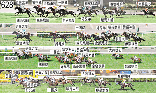 離開跑馬地馬場的馬房前,「精英財星」重新裝上右後蹄的蹄鐵。獸醫檢查「精英財星」後,認適宜出賽。「精英財星」出閘緩慢。躍出時,「大將雄心」被「好兄弟」碰撞,當時「好兄弟」被「緣是燦爛」碰撞後斜跑,而「緣是燦爛」出閘笨拙並且向內斜跑。首次跑過終點柱時,「勇猛神駒」在「駿馬大師」與「金獅勇將」之間處於窘境時收慢,當時「駿馬大師」略為向內斜跑,而「金獅勇將」在難以穩定走勢時將頭轉側,並且略為向外斜跑。「精英財星」因而收慢。趨近千三米處,「駿馬大師」被「好兄弟」挨擦時失去平衡。過了一千米處,「無敵福星」收慢避開「瀟洒叻龍」後蹄時昂首。進入對面直路後,「瀟洒叻龍」被「金獅勇將」阻礙及帶出更外疊,而「金獅勇將」在賽事中段十分難以穩定走勢並且斜跑出更外疊。六百米處轉彎時,「無敵福星」被「金獅勇將」挨擦後失去平衡。在大約最後一百五十米,「精英財星」難以望空。過了一百米處,「一團威」收慢避開「搏得威」後蹄。被查詢時,白德民(「駿馬大師」)解釋,他獲指示讓坐騎順其自然競跑,他預期會居於中間稍前位置。他說,「駿馬大師」出閘普通,但瞬即顯而易見內側數駒會被一路催策上前,因此在接近一千五百米處他選擇收慢坐騎以確保能佔取有遮擋的位置。他說,他因而佔取了大約中間的位置,但接近千三米處「駿馬大師」在「好兄弟」內側一度受擠迫時失去平衡,因而失地。他說,「駿馬大師」因而居於較預期更後的位置,而有見坐騎走勢暢順,他遂讓牠保持在此位置。他說,轉直路彎時「金獅勇將」似乎開始墮退,他因而選擇在該駒內側推進,而沒有移至外側。他說,入直路後不久當「好兄弟」推進時,他移回內側,因該處似乎有空位。當他這樣做時,在他內側的「勇猛神駒」加速,比坐騎更快搶佔了該空位。「駿馬大師」因而在一段短途程上難以望空,但在奔向終點時衝刺乏力。小組告誡白德民,只要情況容許,他應盡力確保坐騎的走位能令其在轉直路彎時及在直路上可暢通無阻地競跑。見習騎師梁家俊(「無敵福星」)解釋,他獲指示將坐騎置於中間位置。他說,跑過千二米處後,「無敵福星」在中間位置放鬆來跑,因此他沒有推進以阻止「瀟洒叻龍」在他前面切入。他說,進入對面直路後,由於受到「金獅勇將」阻礙,「無敵福星」被迫多走腳程。「金獅勇將」及「無敵福星」均須接受獸醫檢查,賽後獸醫檢查「金獅勇將」,發現該駒左前腳不良於行。「金獅勇將」必須通過獸醫檢驗後,才可再次出賽。賽後獸醫檢查「無敵福星」,並無發現任何明顯異常之處。「勇猛神駒」及「搏得威」均須接受抽樣檢驗。