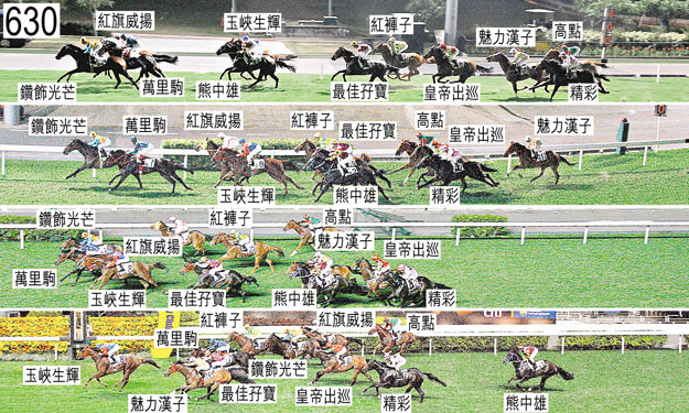 由於「齊歌頌」的宣佈出賽騎師見習騎師蔡明紹於第七場墮馬後,未能履行是賽的策騎聘約,小組考慮練馬師賀賢提出由白德民策騎「齊歌頌」,又或批准讓該駒退出賽事的申請。賀賢解釋,作為「齊歌頌」的練馬師,他只接受由白德民策騎該駒,他又說未能聯絡該駒的馬主。小組決定不批准賀賢提出改由白德民策騎「齊歌頌」的請求,經考慮後他們認為應批准「齊歌頌」退出賽事。小組因而著令「齊歌頌」退出。「紅褲子」及「高點」均出閘緩慢。在早段,「精彩」墮退至後列。在早段及中段,「萬里駒」搶口。接近六百米處,「魅力漢子」勒避「皇帝出巡」後蹄,當時「皇帝出巡」被「最佳孖寶」帶向內跑。六百米處轉彎時,「紅旗威揚」收慢避開「鑽飾光芒」(湯智傑)後蹄,當時「鑽飾光芒」在尚未帶離時向內斜跑。小組譴責湯智傑,並告誡他必須加倍小心。同樣在六百米處轉彎時,「熊中雄」被「玉峽生輝」(潘頓)碰撞及阻礙後失去平衡並且斜跑出更外疊,當「紅旗威揚」因前面出現干擾而收慢時,「玉峽生輝」向外斜跑避開「紅旗威揚」後蹄。小組嚴厲譴責潘頓,並告誡他應作出更大努力收慢坐騎以及保持在內欄位置,而不是向外移出。小組亦告誡他,應更關注同場騎師的安全。接近二百米處,「皇帝出巡」在「熊中雄」與「魅力漢子」(賴維銘)間無路可上時收慢並且向內移入,當時「魅力漢子」在尚未充分帶離時向外斜跑。小組將告誡賴維銘,必須確保已帶離其他馬匹才轉移跑線。在最後大約一百五十米,「高點」在「紅旗威揚」內側難以望空,因而未能全力施為。接近一百米處,「魅力漢子」收慢避開「最佳孖寶」後蹄。「皇帝出巡」須接受獸醫檢查及抽樣檢驗。「熊中雄」須接受獸醫檢查。賽後獸醫檢查這兩駒,並無發現任何明顯異常之處。「萬里駒」、「玉峽生輝」以及「魅力漢子」均須接受抽樣檢驗。