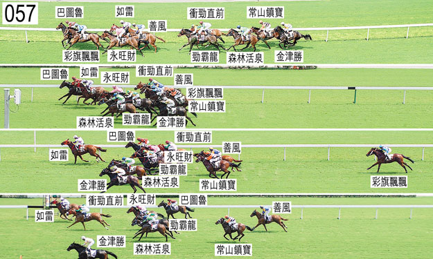 「永旺財」在閘後失去左前蹄的蹄鐵,重新裝上後由獸醫檢查,獸醫認為適宜出賽。「森林活泉」出閘笨拙,其後在早段難以穩定走勢。轉直路彎時,「如雷」自「巴圖魯」後面向外移出以望空,因而碰撞「彩旗飄飄」,當時「彩旗飄飄」開始力弱。「彩旗飄飄」相應向外斜跑,碰撞「永旺財」,「永旺財」因而失去平衡。接近五十米處,「金津勝」受鞭策時急促向著外欄斜跑,導致騎師黎海榮在鞍上嚴重失去平衡。小組向練馬師姚本輝展示此宗事件的影片,並告知他小組會監察此駒日後在陣上的走勢。「永旺財」沿途在外疊競跑,沒有遮擋。被查詢有關「金津勝」在末段的騎法時,黎海榮說,坐騎於接近五十米處急促向外斜跑後,持續向外斜跑,靠近外欄競跑。他說,儘管他一度能夠重新手足並用力策,但他擔心「金津勝」會持續向外斜跑,因此他沒有如常地力策坐騎至終點。小組告知黎海榮,考慮到「金津勝」於接近五十米處急促斜跑,以及該駒持續向外欄斜跑,因此小組將疑點利益應歸於他,不採取進一步行動,但告誡他,在可能的情況下應盡其所能力策坐騎至終點。賽後獸醫檢查「善風」,並無發現任何明顯異常之處。「永旺財」、「如雷」以及「衝勁直前」均須接受抽樣檢驗。賽後,獸醫報告,「永旺財」失去左前蹄的蹄鐵,而且蹄心有一個釘刺傷口。「永旺財」必須通過獸醫檢驗後,才可再次出賽。