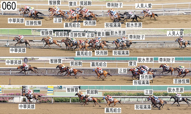 「百勝恆輝」出閘笨拙。「帶利財子」出閘緩慢。首次轉彎時,「質超駒」向內斜跑,挨擦內欄,因而失去平衡。與此同時,「帶利財子」嚴重外閃橫越「快而勝」後蹄,導致「飲水思源」在「祝福滿滿」內側受擠迫時大力勒避,當時「祝福滿滿」被「飲水思源」碰撞後軀時失去平衡。跟隨其後的「人見人愛」因而受阻。轉直路彎時,「快而勝」在「贏馬組合」與「正旋」之間緊迫競跑,當時「正旋」移至「百勝恆輝」外側以望空。入直路後不久,「帶利財子」在「飲水思源」與「寶貝」之間無路可上時收慢,當時「寶貝」在力弱之際略為向外斜跑。被查詢時,見習騎師蔡明紹(「贏馬組合」)說,他獲指示盡可能將坐騎置於前列競跑。他說,「贏馬組合」於閘廂內急躁,其後在早段需時增速。他說,由於坐騎附近的馬匹均能上前過頭,他未能如指示般將坐騎置於前列競跑。他說,「贏馬組合」因而沿途在外疊競跑,沒有遮擋。被查詢時,柏寶說,預期步速會快,他決定嘗試將「寶貝」居前競跑,但不會帶頭。他說,因此他起初置於「中華英雄」後面,繼而在接近八百米處容許此場熱門馬之一的「正旋」越過他。他說,但趨近六百米處,他發覺「寶貝」的走勢未如預期。他過,跑過五百米處他力策「寶貝」,但坐騎對催策毫無反應,表現令人十分失望。被查詢時,韋達說,他能夠將「正旋」置於有利位置,坐騎走勢十分暢順,直至六百米處。他說,此時他力策坐騎,但其後「正旋」的加速力不及他以住策騎時般強勁。他說,他未能就「正旋」是日的走勢提供任何解釋。賽後獸醫檢查「寶貝」及「正旋」,均無發現任何明顯異常之處。「正旋」、「中華英雄」以及「智勝寶」均須接受抽樣檢驗。賽後,獸醫報告「百勝恆輝」流鼻血。