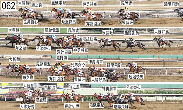 進入跑道時,勞愛德被「大智慧」拋下。勞愛德迅速重新上馬,繼而前往起步點,未有其他事故發生。入直路後不久,「風陵渡」收慢避開「風馳電掣」後蹄。「人緣好馬」在直路早段受困,接近二百米處移至「眾威旺」外側以望空。接近三百米處,傾向內閃的「神勇將軍」勒避「兄弟齊心」後蹄,當時「兄弟齊心」正在墮退。接近五十米處,「大智慧」將頭轉側,向外斜跑。「兄弟齊心」沿途在外疊競跑,沒有遮擋。被查詢時,韋達(「威馬加鞭」)說,他認為坐騎太早企圖躍出,當閘門開啟時看來後腳踢到前腳,因而嚴重失蹄,幾乎跌倒。韋達說,因此他在馬鞍上嚴重失去平衡。他說,起步後不久,他能在「威馬加鞭」馬背上重新取得平衡,但早段坐騎感到動作不妥,不願展步。他說,他容許坐騎留至馬群後面,但他一直有點擔心「威馬加鞭」的動作,直至八百米處轉彎。他說,此時「威馬加鞭」步姿改善,但他已經被馬群拋離。賽後獸醫檢查「兄弟齊心」及「威馬加鞭」,並無發現任何明顯異常之處。「人緣好馬」及「大智慧」均須接受抽樣檢驗。練馬師霍利時報告,「短途快馬」返回馬房後被發現流鼻血。