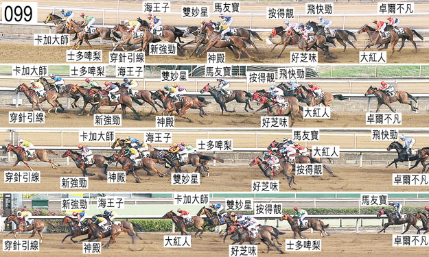 「大將雄心」在閘內煩躁不安,持續腳踢閘廂後門,以致右後腳受傷。「大將雄心」被牽出閘廂由獸醫檢查,獸醫認為不適宜出賽。小組按照獸醫意見著令「大將雄心」退出。「大將雄心」必須試閘及格,並且通過獸醫檢驗後,才可再次出賽。「穿針引線」出閘笨拙,向外斜跑並且碰撞「士多啤梨」。「飛快勁」同樣出閘笨拙,其後不久在「海王子」與「按得靚」之間受擠迫。跑過千四米處,「飛快勁」不願在「神殿」內側競跑時失去平衡。都爾(「穿針引線」)承認一項不小心策騎〔賽事規例第100(1)條〕,事緣在趨近千二米處在一段途程上,他未有為內側的「按得靚」、「馬友寶」以及「卓爾不凡」提供足夠的競賽空間,導致這三駒在一段途程上緊迫競跑,「卓爾不凡」因而於接近千二米處勒避。小組判罰都爾停賽(兩個香港賽馬日)直至十一月五日星期四才可再次出賽。此項停賽罰則押後至十月二十五日星期日沙田賽事後執行。「按得靚」在中段難以穩定走勢。「飛快勁」於六百五十米處轉彎時走勢笨拙並且失去平衡。六百米處,「神殿」被「雙妙星」碰撞並且帶出外疊,當時「雙妙星」移至「新強勁」外側。「海王子」在直路早段受困。「穿針引線」沿途在外疊競跑,沒有遮擋。賽後獸醫檢查「馬友寶」,並無發現任何明顯異常之處,然而獸醫報告,由於該駒太過煩躁,他未能替該駒進行內窺鏡檢查。賽後獸醫檢查「卓爾不凡」,發現該駒右後蹄跖骨內側有一處細小割傷。賽後獸醫檢查「飛快勁」,內窺鏡檢查顯示該駒患有「喘鳴症」。「飛快勁」包尾大敗而回,小組認為該駒的表現難以接受。「飛快勁」必須試閘及格,並且通過獸醫檢驗後,才可再次出賽。「海王子」、「穿針引線」以及「新強勁」均須接受抽樣檢驗。賽後,獸醫報告「穿針引線」失去右前蹄的蹄鐵。