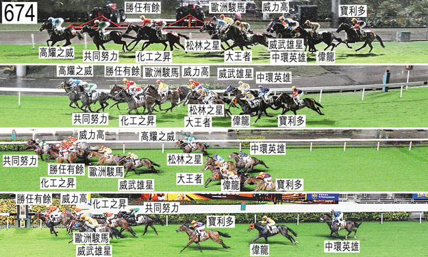 「偉龍」挨倚閘廂外側,出閘緩慢。「威力高」出閘笨拙。都爾(「大王者」)承認一項不小心策騎〔賽事規例第100(1)條〕,事緣在接近千五米處,他在尚未帶離「寶利多」時容許坐騎向內斜跑,導致「寶利多」勒避並且失蹄。小組判罰都爾停賽(三個香港賽馬日)直至七月八日星期四才可再次出賽。此項停賽罰則將於六月二十八日星期一開始執行,亦即都爾於六月六日星期日沙田賽事被罰停賽期滿可恢復出賽當日。此外,都爾被罰款二萬元,以代替停賽多一個賽馬日。千五米處,「偉龍」在「寶利多」與「高耀之威」之間受擠迫時勒避,當時「寶利多」被「大王者」帶向內跑,而「高耀之威」略為向外斜跑。接近一千米處,「中環英雄」靠近「松林之星」後蹄處於窘境時昂首。接近九百米處,「威武雄星」推進至「中環英雄」內側一個窄位後,「威力高」與「威武雄星」在「中環英雄」內側緊迫競跑。小組不採取行動。跑了一段短途程後,「中環英雄」在「威武雄星」與「大王者」之間處於窘境時收慢。接近六百五十米處,「中環英雄」與「偉龍」互相碰撞。入直路時,「松林之星」在「大王者」與「威武雄星」(湯智傑)之間受擠迫時失去平衡,當時「威武雄星」向外移出以改善位置。小組譴責湯智傑,並告誡他向外移出以改善位置時必須較今次更加小心。黎海榮(「化工之昇」)承認一項不小心策騎〔賽事規例第100(1)條〕,事緣在趨近二百米處,他在尚未帶離「歐洲駿馬」時容許坐騎向內斜跑,導致「歐洲駿馬」失去應有的跑線,必須收慢避開「化工之昇」後蹄。小組判罰黎海榮停賽(兩個香港賽馬日)直至七月二日星期五才可再次出賽。此項停賽罰則押後至六月二十日星期日跑馬地賽事後執行。此外,黎海榮被罰款三萬元,以代替停賽多一個賽馬日。「大王者」沿途在外疊競跑,沒有遮擋。「高耀之威」大敗而回,小組認為其表現難以接受。「高耀之威」必須試閘及格,並且通過獸醫檢驗後,才可再次出賽。賽後獸醫檢查「中環英雄」及「高耀之威」,內窺鏡檢查顯示這兩駒的氣管內均有很多膿痰。「勝任有餘」及「威力高」均須接受抽樣檢驗。