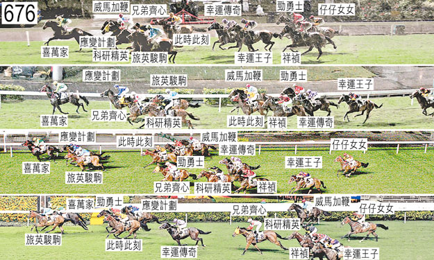 確定馬匹名次前,小組亮起押後宣佈覆磅完畢的燈號,以考慮「勁勇士」是否獲公平出閘。在研訊燈號亮起後,評判員宣佈「勁勇士」為第三名。根據賽事規例第12(19)條,在賽事中已宣佈為第一、第二或第三名的馬匹不得被宣佈為無出賽馬匹,因此小組不採取行動,確定宣佈覆磅完畢並確定評判員宣佈的名次。就在開閘前,「勁勇士」將頭低俯,因而出閘緩慢。「科研精英」及「此時此刻」均出閘緩慢。出閘後不久,「科研精英」及「祥禎」均在「旅英駿駒」與「幸運王子」之間受擠迫時受阻,當時「幸運王子」收慢避開「幸運傳奇」後蹄時向外斜跑,而「幸運傳奇」將頭轉側並且向外斜跑。跑過八百米處,「此時此刻」靠近「應變計劃」後蹄處於窘境時收慢。其後,「此時此刻」數度昂首,十分難以穩定走勢。過了六百米處首次轉彎時,「祥禎」及「此時此刻」均將頭轉側並且向外斜跑。其後,「祥禎」持續外閃。在最後一百米,由於「勁勇士」與「此時此刻」均斜跑,兩駒因而數度互相觸碰。「科研精英」沿途在外疊競跑,沒有遮擋。被查詢有關「兄弟齊心」的騎法時,見習騎師楊明綸說,早段他一路催策坐騎以依照指示佔取前列位置。他說,跑過八百米處,他在「應變計劃」外側競跑,他以為「應變計劃」內側尚有兩駒。他說,因此他在「應變計劃」外側保持一些空位,因為他不想對內側的馬匹造成干擾。他說,由於他不貼近「應變計劃」競跑,當「應變計劃」向內移至內欄時,「旅英駿駒」因而得以推進至「兄弟齊心」內側。他說,首次轉彎時,「旅英駿駒」的騎師向他呼叫,令他發覺該駒正貼近坐騎的後蹄競跑,因此他未能自第三疊移至第二疊。他說,趨近四百米處,「旅英駿駒」的騎師再次向他發出警告,他因而將坐騎進一步向外移出,因他覺得他可能對內側的馬匹造成干擾。他又說,這樣令「兄弟齊心」與「科研精英」大力觸碰,兩駒均因而嚴重失去平衡。小組告誡見習騎師楊明綸,他策騎「兄弟齊心」的方式缺乏應有的判斷力,他應更加果斷地將「兄弟齊心」直接移至「應變計劃」的外側,而不應讓他駒得以推進至其內側,從而導致「兄弟齊心」不必要地多走腳程。賽後獸醫檢查「科研精英」及「祥禎」,並無發現任何明顯異常之處。「此時此刻」、「旅英駿駒」以及「喜萬家」均須接受抽樣檢驗。賽後,獸醫報告「兄弟齊心」失去一對前蹄的蹄鐵。