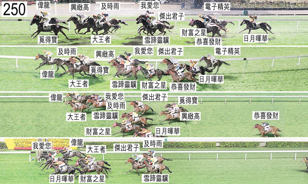 入閘後,「恭喜發財」煩躁不安,以後足豎立,王志偉因而被拋下。在此宗事件中,「恭喜發財」的馬鞍滑移。「恭喜發財」被牽引出閘廂,重新配鞍後接受獸醫檢查,獸醫認為該駒適宜出賽。「恭喜發財」必須經閘廂測試及格後,才可再次出賽。「大王者」出閘笨拙,繼而被「偉龍」碰撞,「大王者」因而向外斜跑,碰撞「興緻高」的後軀。「日月暉華」出閘緩慢。接近千一米處,難以穩定走勢的「傑出君子」,收慢避開「大王者」後蹄時昂首。接近九百米處,「大王者」向外斜跑避開「興緻高」後蹄,當時「興緻高」被收慢。過了七百米處,「大王者」在沒有遮擋下競跑。「覓得寶」在外疊沒有遮擋下競跑,直至跑過七百米處時向內移入至第二疊。接近五百米處,「傑出君子」試圖在「興緻高」與「雪蹄靈驥」之間取位時勒避,當時該處空位不足。當「傑出君子」勒避時,跟隨在後的「財富之星」因而勒避,向外斜跑,並且與「恭喜發財」互相觸碰。與此同時,「我愛您」收慢避開「及時雨」後蹄。進入直路時,「興緻高」向外斜跑,碰撞「雪蹄靈驥」,「雪蹄靈驥」因而失去平衡。接近終點時,「財富之星」收慢避開「日月暉華」後蹄,當時「日月暉華」向內斜跑。「電子精英」包尾大敗而回,賽後獸醫檢查該駒,發現該駒心律不正常。「電子精英」必須試閘及格,並且通過獸醫檢驗後,才可再次出賽。賽後獸醫檢查「興緻高」,並無發現任何明顯異常之處。「偉龍」、「我愛您」以及「日月暉華」均須接受抽樣檢驗。