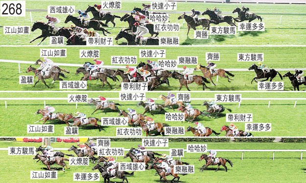 「齊勝」起步時在「西域雄心」與「紅衣叻叻」之間受擠迫,當時「紅衣叻叻」將頭轉側並且向內斜跑避開「江山如畫」。「帶利財子」及「哈哈妙」均出閘笨拙。「東方駿馬」起步時在「火燎腚」與「快達小子」之間受擠迫,當時「快達小子」向外斜跑。跑過七百米處時,「紅衣叻叻」開始搶口,勒避「盈驥」的後蹄時在一段途程上昂首。跑過六百米處時,「哈哈妙」在「紅衣叻叻」內側一度受擠迫,當時「紅衣叻叻」持續搶口之際向內斜跑。同樣在跑過六百米處時,「西域雄心」在「火燎腚」與「盈驥」之間的窄位競跑。跑過二百米處時,正以勁勢衝刺的「東方駿馬」向外移出避開「快達小子」後蹄。接近終點時,「齊勝」被「火燎腚」碰撞,當時「火燎腚」向內斜跑。在大部分途程上,「盈驥」在外疊競跑,沒有遮擋。賽後獸醫檢查「紅衣叻叻」及「哈哈妙」,並無發現任何明顯異常之處。「紅衣叻叻」、「江山如畫」以及「東方駿馬」均須接受抽樣檢驗。