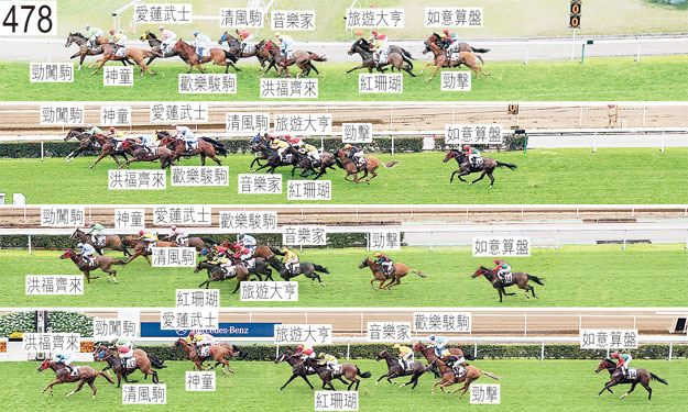 「領彩」入閘後煩躁不安,在閘廂前門下面衝出,此時「領彩」的馬鞍跌下。當「領彩」自閘廂前門下面衝出時,「頭等艙」在閘內煩躁不安,以後足豎立並且倒下。當「頭等艙」倒下時,後腳數度踢高,並踢中排在其內側檔位的「明海光輝」。「明海光輝」被「頭等艙」踢中時亦變得煩躁不安,將左後腳擱在閘內的踏板上。「領彩」被牽回起步點,而「頭等艙」及「明海光輝」被牽出閘廂。三駒均由獸醫檢查,獸醫認為各駒都不適宜出賽。因此,小組著令「領彩」、「頭等艙」及「明海光輝」退出賽事。「領彩」及「頭等艙」均須試閘及格,並且通過獸醫檢驗後,才可再次出賽。「明海光輝」必須經閘廂測試及格,並且通過獸醫檢驗後,才可再次出賽。在此宗事件中,「明海光輝」的騎師白德民右腳受傷,馬會醫生認為他不適宜策騎出賽。小組著令全部馬匹牽出閘廂,賽事延遲開跑。「勁擊」起初入閘時一度觸碰閘廂,獸醫檢查後,認為該駒適宜出賽。重新入閘時,「勁擊」入閘困難。「勁擊」必須經閘廂測試及格後,才可再次出賽。「紅珊瑚」自外檔出閘後不久在馬群後面切入。接近一千米處時,「紅珊瑚」在僅僅帶離時收慢避開「洪福齊來」後蹄。接近八百米處時,「音樂家」將頭轉側,向外斜跑橫越「歡樂駿駒」後蹄。接近七百米處時,「洪福齊來」靠近「歡樂駿駒」後蹄處於窘境時數度昂首。接近六百米處時,「如意算盤」收慢避開「旅遊大亨」後蹄。過了六百米處後,「紅珊瑚」在「勁擊」與「音樂家」(黎海榮)之間受擠迫時失去平衡,當時「音樂家」向外斜跑。小組嚴厲譴責黎海榮,並告誡他日後必須確保已充分帶離後才可轉移跑線。在直路早段,「愛蓮武士」受困。其後跑過二百米處時,「愛蓮武士」試圖佔取「勁闖駒」與「神童」之間的位置時收慢,當時該處空位不足。跑過三百米處時,「音樂家」及「旅遊大亨」均在「紅珊瑚」與「清風駒」之間緊迫競跑,當時「清風駒」向外斜跑。在此宗事件中,「旅遊大亨」及「音樂家」均失去平衡。跑過一百米處時,「勁闖駒」急促向外斜跑橫越「神童」的跑線,「神童」因而須收慢避開「勁闖駒」的後蹄。賽後獸醫檢查「歡樂駿駒」,並無發現任何明顯異常之處。「洪福齊來」及「勁闖駒」均須接受抽樣檢驗。