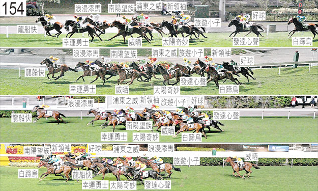 「浪漫添馬」起步時向內斜跑,導致「南陽望族」與「浦東之威」均受阻礙。「新領袖」出閘緩慢。「發達心聲」自外檔起步後不久在馬群後面切入。起步後不久,「白蹄烏」在馬群後面切入。首次跑過終點時,「新領袖」在「旅遊小子」內側緊迫競跑,當時「旅遊小子」靠近「南陽望族」後蹄處於窘境。轉直路彎及在直路早段,「幸運勇士」將頭轉側及外閃。被騎師修正後,「幸運勇士」於接近二百五十米處時急促向內斜跑,導致「南陽望族」與「浦東之威」均在「浪漫添馬」外側受擠迫。由於小組認為「幸運勇士」此時走勢稚嫩,而此宗事件並非由於騎師犯錯所致,因而不採取進一步行動。「發達心聲」難以望空直至趨近二百米處。接近一百五十米處時,「浦東之威」在雙雙斜跑的「南陽望族」與「浪漫添馬」之間的窄位競跑。「威晒」沿途在外疊競跑,沒有遮擋。被查詢有關「浪漫添馬」令人失望的表現時,柏寶說,他獲指示盡可能佔取領放馬匹之後的位置。他說,「浪漫添馬」出閘十分迅速,當「浦東之威」與「南陽望族」均居於其內側競跑時,他須在早段一路催策「浪漫添馬」以帶離該兩駒。他說,首次跑過終點時他能佔取貼欄的位置,繼而於過了千一米處後當「龍船快」改善位置上前時自該駒後面獲得遮擋。他說,被「龍船快」超越後,「浪漫添馬」走勢暢順直至四百米處,此時坐騎已須受催策。他又說,「浪漫添馬」在直路上數度斜跑,動作感覺不盡暢順。他說,「浪漫添馬」其後在末段尤以在最後二百米內未能以勁勢衝刺,令人失望。賽後獸醫檢查「浪漫添馬」,並無發現任何明顯異常之處。「白蹄烏」及「南陽望族」均須接受抽樣檢驗。