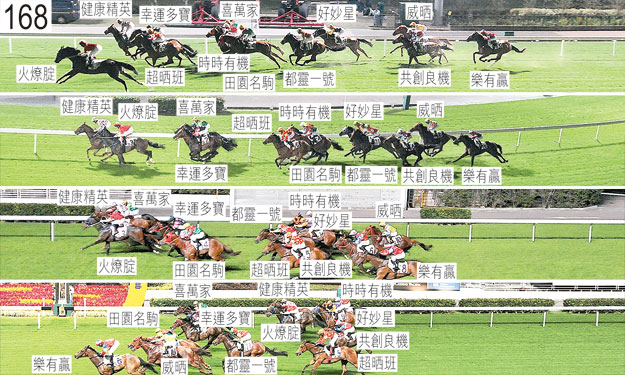 「火燎腚」出閘笨拙。「威晒」出閘笨拙,起步後不久被「好妙星」碰撞時失地,當時「好妙星」被「幸運多寶」帶向外跑,而「幸運多寶」被「時時有機」碰撞後向外斜跑。「健康精英」出閘緩慢。「樂有贏」及「共創良機」自外檔起步後不久均在馬群後面切入。趨近四百米處時,「都靈一號」收慢避開「田園名駒」後蹄。「好妙星」在最後一百米未能望空,因而未能全力施為。鄭雨滇(「田園名駒」)被裁定一項不小心策騎〔賽事規例第100(1)條〕,事緣在趨近一百米處時,他容許坐騎向內斜跑橫越「都靈一號」,導致「都靈一號」失去應有的跑線並且受阻礙。小組判罰鄭雨滇停賽(兩個香港賽馬日)直至十二月十二日星期一才可再次出賽。此項停賽罰則押後至十二月四日星期日沙田賽事後執行。此宗事件後,「田園名駒」向外斜跑,導致當時嘗試在「田園名駒」外側確立跑線的「都靈一號」在餘下途程上勒避該駒的後蹄。「都靈一號」因而沒有如常地被力策至終點。在「都靈一號」外側競跑的「威晒」被帶出更外疊,而開始墮退的「超晒班」收慢避開「威晒」後蹄。小組告誡鄭雨滇,儘管小組認為「都靈一號」尚未在「田園名駒」外側確立跑線,但仍譴責他,並告誡他應盡力阻止坐騎斜跑。賽後獸醫檢查「健康精英」及「好妙星」,並無發現任何明顯異常之處。「健康精英」、「樂有贏」以及「威晒」均須接受抽樣檢驗。