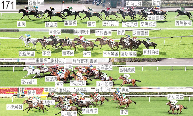 「勝利多」於十一月十五日被小組按照獸醫意見(右後腳不良於行)著令退出,並由後備「精密紡」(郭能)補上。「勝利多」必須通過獸醫檢驗後,才可再次出賽。起步後不久,「善風」收慢避開「勝利就手」後蹄,當時「勝利就手」向外斜跑。「高明威威」自外檔出閘後不久在馬群後面切入,其後沿途在外疊競跑,沒有遮擋,在直路上墮退。首次跑過終點時,「橫亨」向內移入至「精密紡」後面以獲取遮擋時收慢避開該駒後蹄。趨近及跑過千二米處被收慢後,「錢程萬里」難以穩定走勢。趨近四百米處時,「精密紡」靠近「正榮」後蹄處於窘境。入直路時,「重量級」嘗試移至「錢程萬里」外側時與「正榮」互相碰撞。接近三百米處時,「精密紡」與「橫亨」互相碰撞。被查詢時,見習騎師何澤堯(「百利拍檔」)說,他獲指出自第九檔出閘後盡可能把坐騎置於中間位置。他說,排在其內側檔位的「橫亨」出閘後受一路催策以佔取前列位置,因此他將「百利拍檔」移至「橫亨」後面。他說,跑了一段短途程後,他察覺「時尚吉祥」佔取了「不老英雄」後面的第二疊位置。他說,由於「善風」在「不老英雄」內側競跑,他相信「不老英雄」須保持走第二疊,因此他選擇將坐騎移至「時尚吉祥」後面。他又說,由於他覺得假如繼續在「時尚吉祥」外側競跑的話,坐騎將被迫走第三疊,因而下此決定。他說,然而,首次跑過終點時,「善風」在「時尚吉祥」內側緊迫競跑後被騎師收慢以讓「時尚吉祥」切入內欄。他說,基於這些因素,「百利拍檔」居於較打算更後的位置競跑。賽後獸醫檢查「高明威威」,發現該駒左後蹄球節後面有一處擦傷。「百利拍檔」、「不老英雄」以及「橫亨」均須接受抽樣檢驗。