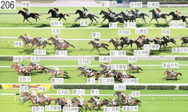 起步後不久,「好玩神駒」收慢避開「軍士」後蹄,當時「軍士」被「皇仁勁駒」帶向外跑。「同感」、「日月暉華」以及「業盛於和」均自外檔出閘後不久在馬群後面切入。跑過一千米處時,難以穩定走勢的「火燎腚」收慢避開「百利旺」後蹄。其後趨近八百米處時,「火燎腚」持續搶口及勒避「百利旺」後蹄時嚴重失去平衡。接近八百米處時,「魅力心」被「皇仁勁駒」帶出更外疊,當時「皇仁勁駒」向外斜跑避開「名馬」後蹄,「名馬」則在靠近「金財子」後蹄處於窘境時自己向外斜跑,當時「金財子」在難以穩定走勢,並靠近「神童」後蹄處於窘境後移離內欄,佔取「神童」外側的位置。其後,「魅力心」在沒有遮擋下走外疊。「軍士」在沒有遮擋下走外疊直至接近六百米處。過了六百米處後,「火燎腚」持續收慢避開「百利旺」後蹄時昂首。自進入直路後不久至接近一百米處,「名馬」在「神童」內側的窄位競跑。過了三百米處後,「日月暉華」在「好玩神駒」與「皇仁勁駒」之間的窄位競跑,當時「皇仁勁駒」被「軍士」略為帶向外跑。過了二百米處後,「金財子」將頭轉側並內閃,過了一百米處後被「神童」碰撞,當時「神童」向外斜跑。在末段,「日月暉華」將頭轉側並內閃。賴維銘(「百利旺」)承認一項不小心策騎〔賽事規例第100(1)條〕,事緣在末段,他容許坐騎向外斜跑,導致「魅力心」大力勒避,繼而被帶向外跑壓向「軍士」,當時「軍士」在「魅力心」外側競跑,「軍士」亦同樣須大力勒避。小組判罰賴維銘停賽(三個香港賽馬日)直至十二月二十二日星期四才可再次出賽。此項停賽罰則於十二月十二日星期一開始執行,即他於二○一一年十一月二十七日星期日沙田賽事被罰停賽之罰則期滿後可恢復出賽當天。此外,賴維銘被罰款一萬五千元,以代替停賽多一個賽馬日。接近終點時,「好玩神駒」在「日月暉華」外側緊迫競跑。就在終點前,賴維銘在「百利旺」於末段向外斜跑後須修正坐騎,因而停止催策「百利旺」。被查詢時,郭能說,他獲指示自第九檔出閘後以比過往較為留後的方式策騎「火燎腚」。他說,他獲解釋,過往「火燎腚」在早段須被催策以佔取前列位置,其後在末段未能如所願般以勁勢衝刺。他說,因此他需確保「火燎腚」出閘不會太迅速,然而,這樣做時,坐騎起步時向上跳躍,出閘十分笨拙及失地。他說,其後他嘗試收慢「火燎腚」至大約中間位置,然而,坐騎沿途數度難以穩定走勢。他又說,「火燎腚」在直路上未能以勁勢衝刺,然而,這是因為坐騎在陣上未能穩定走勢所致。「名馬」及「金財子」均須接受抽樣檢驗。