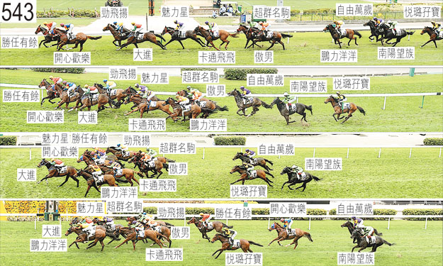 勞愛德(「卡通飛飛」)起初過磅時沒有攜帶馬肚帶及「三星」帶,被罰款二千元。「自由萬歲」起步時昂首,出閘笨拙。其後,「自由萬歲」在馬群後面切入。過了千二米處後,「鵬力洋洋」靠近「傲男」後蹄處於窘境時昂首,當時「傲男」靠近「卡通飛飛」後蹄競跑。其後在一段途程上,「傲男」持續靠近「卡通飛飛」後蹄處於窘境,一度向外斜跑避開該駒後蹄。當「卡通飛飛」向外斜跑時,持續難以穩定走勢的「鵬力洋洋」推進至「傲男」內側的窄位。「傲男」(楊明綸)繼而略為向內移入,導致「鵬力洋洋」被帶向內跑橫越「自由萬歲」的跑線,「自由萬歲」因而大力勒避。在「自由萬歲」外側競跑的「南陽望族」因而受阻礙。小組告誡楊明綸,儘管此宗事件涉及多個因素,尤其是賽事步速以及時當時「傲男」與「鵬力洋洋」的走勢,但無論如何,在向外斜跑後,他在向內移回之前應更加警覺到已有馬匹推進至其內側。小組譴責楊明綸,並告誡他日後須加倍小心。接近九百米處時,持續搶口的「鵬力洋洋」向內斜跑避開「傲男」後蹄,當時「傲男」亦難以穩定走勢,並且靠近「卡通飛飛」後蹄處於窘境。當「鵬力洋洋」向內斜跑時,在其內側競跑的「自由萬歲」再次勒避。接近四百米處時,「自由萬歲」勒避「超群名駒」後蹄。接近一百五十米處時,「勝任有餘」在催策下向外斜跑,並且碰撞「超群名駒」。趨近一百米處時,正在墮退的「開心歡樂」在「超群名駒」與「傲男」之間受擠迫時收慢,當時「超群名駒」略為向外斜跑,而「傲男」向內斜跑避開「卡通飛飛」後蹄,「卡通飛飛」則在「鵬力洋洋」後蹄內側處於窘境時向內斜跑。小組不採取行動。在末段,「超群名駒」靠近「魅力星」後蹄處於窘境。「超群名駒」因而未能全力施為。被查詢有關「傲男」於跑過五百米處時的騎法時,楊明綸說,此時坐騎在靠近「卡通飛飛」後蹄處於窘境時一度向外斜跑。他說,考慮到「傲男」在早段及中段搶口,他不願在此時將坐騎移至「卡通飛飛」外側,而希望讓坐騎持續維持有遮擋,以令牠在末段能以勁勢衝刺。他說,因此他將「傲男」向內移回,以繼續在「卡通飛飛」後面競跑。他說,此時「鵬力洋洋」在其外側迅速推進。他說,當他注意到「鵬力洋洋」在「傲男」外側推進時,他嘗試移至「卡通飛飛」外側,但「鵬力洋洋」維持走勢,他未能自「卡通飛飛」後面向外移出。他又說,當他嘗試向外移出時,「鵬力洋洋」與「傲男」互相碰撞。他說,其後「傲男」在轉直路彎時受困而未能望空。在觀看過賽事影片後,楊明綸承認他沒有將「傲男」移至「卡通飛飛」外側而讓頭馬「鵬力洋洋」在此時有機會在他外側推進是錯誤的做法。小組告誡楊明綸,小組認為他欠缺騎師在這情況下應有的判斷力。小組進一步告誡他,須確保其騎法能給予坐騎有充分機會望空。賽後獸醫報告,「鵬力洋洋」失去左前蹄及右後蹄的蹄鐵,以及右後蹄跖骨有一個擦傷的傷口。賽後獸醫檢查「自由萬歲」,並無發現任何明顯異常之處。「超群名駒」、「鵬力洋洋」以及「大進」均須接受抽樣檢驗。