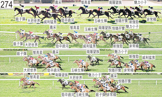 起步後不久,「魅力小子」及「玉峽生輝」均在「晨采」與「勁卒過河」之間受擠迫,當時「晨采」向外斜跑,而「勁卒過河」則在起初被「大把世界」帶向內跑後向內斜跑。 首次趨近終點時,「南陽望族」將頭轉側,並靠近「智高星」後蹄處於窘境。首次跑過終點時,「智高星」失去平衡。一段短途程後,「智高星」向外斜跑並碰撞「悅璐孖寶」,導致「新強勁」一度在「勁卒過河」內側受擠迫。其後於接近千三米處時,「智高星」勒避「晨采」(潘頓)後蹄時昂首,當時「晨采」在僅僅帶離時向內斜跑。小組告誡潘頓,在類似情況下轉移跑線時必須確保已充分帶離。 跑過千一米處時,「非常精」開始十分難以穩定走勢,須大力勒避「悅璐孖寶」後蹄。當勒避「悅璐孖寶」後蹄時,「非常精」向內斜跑,並擠迫「魅力小子」。其後「非常精」持續難以穩定走勢,過了一千米處後勒避「悅璐孖寶」後蹄時昂首。 過了六百米處後在一段途程上,「魅力小子」在「悅璐孖寶」內側緊迫競跑,當時「悅璐孖寶」在一路催策下稍微斜跑。 轉直路彎時,「魅力小子」再度在「悅璐孖寶」內側緊迫競跑。 接近二百五十米處時,「智高星」向內斜跑避開「大把世界」後蹄以繼續推進。「威利猛男」沿途在外疊競跑,沒有遮擋,在直路上墮退。 被查詢時,王志偉(「悅璐孖寶」)說,趨近千二米處時,坐騎被「智高星」略為帶向外跑,當時「智高星」移離內欄。他說,他繼續保持在「智高星」外側半個馬位之後的位置直至跑過千二米處後。然而,此時「智高星」再度移離內欄。他說,由於覺得「智高星」很大可能會移至第二疊的位置,因此他選擇不保持在該駒外側的位置,以避免「悅璐孖寶」被頂出第三疊的位置。他又說,當趨近千一米處「智高星」移回內欄時,讓「玉峽生輝」有機會在「悅璐孖寶」前面向內移入。 被查詢有關「晨采」令人失望的表現時,潘頓說,坐騎沿途在領放馬「銀子彈」後面的好位競跑,其後於趨近六百米處時在該駒後面須受催策以保持位置。他說,由於「晨采」未有如他預期加速,因此在直路彎前已開始一路催策坐騎,其後在直路上力策「晨采」時,坐騎對其催策毫無反應,走勢令人失望。他又說,是賽前他曾策騎「晨采」進行數課操練,他認為「晨采」在這些操練中的表現相當出色。他說,按照「晨采」在是賽前的操練表現,他覺得該駒在是賽事中甚具爭勝機會。賽後獸醫檢查「晨采」,並無發現任何明顯異常之處。 賽後獸醫檢查「新強勁」,內窺鏡檢查顯示該駒的氣管內有很多膿痰。「新強勁」包尾大敗而回,小組認為該駒的表現難以接受。「新強勁」必須試閘及格,以及通過獸醫檢驗後,才可再次出賽。 「智高星」及「南陽望族」均須接受抽樣檢驗。