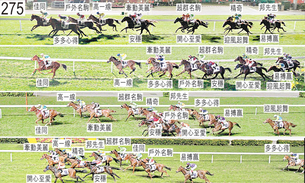 「邦先生」自大外檔起步後不久在馬群後面切入。首次趨近終點時,「牽動美麗」一度在「安穩」內側的窄位競跑,當時「安穩」斜跑避開「高一線」後蹄。在早段,「多多心得」在外疊競跑,沒有遮擋,過了一千米處後獲許上前改善位置。跑過千四米處時,「精奇」一度在「超群名駒」內側的窄位競跑之際將頭轉側及向著該駒的後蹄斜跑,當時「超群名駒」將頭轉側及向內斜跑避開「開心至愛」。一段短途程後,「精奇」勒避「超群名駒」的後蹄。跑過千二米處時,「安穩」靠近「戶外名駒」後蹄處於窘境。跑過千一米處時,「精奇」一度在「迎風起舞」內側受擠迫之際失地,當時「迎風起舞」將頭轉側及略為向內斜跑。跟隨其後的「易搏贏」因而急促向外斜跑避開「精奇」後蹄。被查詢時,郭能(「戶外名駒」)說,他獲指示盡可能嘗試佔取領放馬匹後面有遮擋的位置。他說,自第十一檔起步後他須一路催策「戶外名駒」以帶離內側的馬匹,其後坐騎在早段未能取得遮擋,因而傾向搶口。他說,過了七百米處後他讓「多多心得」超越「戶外名駒」,因該駒可為坐騎提供遮擋。他說,過了六百米處後轉彎時他保持在「多多心得」後面競跑,此時該駒略為向外斜跑。他說,趨近四百米處當「多多心得」起初開始墮退時他不願移至該駒外側,這是因為「戶外名駒」在早段及中段均跑來搶口,他不想將坐騎移出外疊,而且他亦覺得「多多心得」或有機會略為向外斜跑,從而讓「戶外名駒」可推進至該駒內側。他又說,然而,當「多多心得」保持在第二疊競跑以及在跑過四百米處開始墮退時,他將坐騎移至該駒後蹄外側以望空,而坐騎在末段衝刺不俗。小組告誡郭能,他的解釋會被載入報告,但他須盡可能確保坐騎能持續推進,尤其是在賽事的關鍵階段。賽後馬偉昌表示關注「多多心得」的動作。賽後獸醫檢查「多多心得」,並無發現任何明顯異常之處。賽後獸醫檢查「超群名駒」,內窺鏡檢查顯示該駒的氣管內有很多血。「超群名駒」必須通過獸醫檢驗後,才可再次出賽。賽後獸醫檢查「易搏贏」以及「佳同」,並無發現任何明顯異常之處。「牽動美麗」及「開心至愛」均須接受抽樣檢驗。