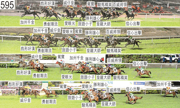 「百威將領」出閘緩慢。 「駕寶」起步時在雙雙斜跑的「加州千金」與「旅遊小子」之間受擠迫。 「信心出擊」自大外檔出閘後不久在馬群後面切入。 首次跑過終點時,「愛眼光」收慢避開「加州千金」(蘇狄雄)後蹄,當時「加州千金」向內斜跑。小組嚴厲譴責蘇狄雄,並告誡他,儘管小組考慮到「加州千金」陣上的走勢欠佳,但仍預期他在類似情況下須比是次作出更大努力阻止坐騎斜跑。 跑過千一米處時,「勝利雄心」靠近「愛眼光」後蹄處於窘境,當時「愛眼光」在走勢稚嫩之際靠近「勇創潮流」後蹄競跑。 趨近一千米處時,「旅遊小子」在外疊競跑,沒有遮擋。 趨近及跑過八百米處時在一段途程上,「勝利雄心」持續靠近「愛眼光」後蹄競跑,當時「愛眼光」持續難以穩定走勢。 「百威將領」在直路早段受困而未能望空,接近二百米處時移至「旅遊小子」內側。其後接近一百米處時,「百威將領」嘗試佔取「愛眼光」與「旅遊小子」之間的窄位時再度難以望空。 「加州千金」沿途外閃及走勢稚嫩。小組認為「加州千金」的表現難以接受。「加州千金」必須在轉彎途程上試閘及格後,才可再次出賽。 韋達(「愛眼光」)說,首次跑過終點後讓「勇創潮流」過頭以取得遮擋後,「愛眼光」繼而在靠近「勇創潮流」後蹄處於窘境時走勢強勁,當時「勇創潮流」在超越「愛眼光」後收慢。他說,考慮到賽事的形勢以及「愛眼光」陣上的走勢,他認為坐騎在末段衝刺理想。賽後獸醫立即檢查「愛眼光」,並無發現任何明顯異常之處。 賽後獸醫立即檢查「信心出擊」與「加州千金」,並無發現任何明顯異常之處。 「愛眼光」、「彪形好漢」以及「威仔皇」均須接受抽樣檢驗。
