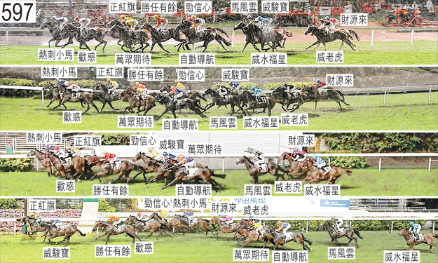 抵達閘廂後,「威老虎」更換繫舌帶。 入閘困難後,「熱刺小馬」煩躁不安、以後足豎立,並一度將左前腳擱在閘廂間隔上。「熱刺小馬」被牽出閘廂接受獸醫檢查,獸醫表示該駒適宜出賽。「熱刺小馬」必須經閘廂測試及格後,才可再次出賽。 「勁信心」起步時在「威水福星」與「威駿寶」之間受擠迫,當時「威水福星」出閘笨拙,而「威駿寶」則向內斜跑。 起步後不久,「馬風雲」在「威駿寶」與「威老虎」之間受擠迫,當時「威老虎」被「熱刺小馬」帶向內跑。 同樣在起步後不久,「萬眾期待」與「財源來」互相碰撞。其後,自大外檔出閘的「財源來」在馬群後面切入。 儘管在早段被一路猛烈催策,但「威水福星」未能增速。 跑過千六米處時,「勁信心」靠近「自動導航」後蹄處於窘境,當時「自動導航」被「正紅旗」帶向外跑。 跑過千四米處時,「自動導航」靠近「勝任有餘」後蹄處於窘境時開始走勢強勁及向外斜跑,當時「勝任有餘」收慢避開「歡惑」後蹄。當「自動導航」向外斜跑時,「威水福星」被帶出更外疊。 過了九百米處後,「威水福星」靠近「自動導航」後蹄處於窘境時昂首。 過了三百米處後,「正紅旗」一度在「熱刺小馬」與「歡惑」之間的窄位競跑,當時「歡惑」向內斜跑。 接近一百五十米處時,「勝任有餘」向外移出避開「歡惑」後蹄,當時「歡惑」被「正紅旗」碰撞後向外斜跑。 一百米處,「勁信心」向內移入避開「歡惑」後蹄,當時「歡惑」將頭轉側及急促向內斜跑。 「萬眾期待」沿途在外疊競跑,沒有遮擋。 賽後獸醫立即檢查「威老虎」及「自動導航」,並無發現任何明顯異常之處。 「正紅旗」及「威駿寶」均須接受抽樣檢驗。 <9/5/2013 獸醫報告增補>表現欠佳的「自動導航」於賽後曾由主任獸醫(賽事管制)檢查,當時他說並無發現明顯異常之處。主任獸醫(賽事管制)今晨在練馬師方嘉柏的馬房再次檢查「自動導航」時,發現該駒右前腿不良於行。「自動導航」必須通過獸醫檢驗後,才可再次出賽。