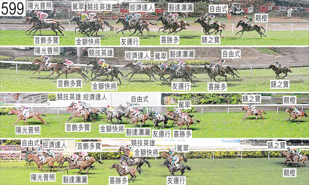 「靚橙」出閘僅屬普通,起步後不久被「自由式」碰撞,當時「自由式」向內斜跑。 起步後不久,「豁達瀟灑」在「喜勝多」與「友運行」之間受擠迫時失去平衡,當時「友運行」將頭轉側及向內斜跑。 「錶之寶」自大外檔出閘後不久在馬群後面切入。 首次跑過終點時,「駕翠」向內斜跑,導致「金獅快將」被帶向內跑並與「經濟達人」互相觸碰。 跑過千三米處時,「豁達瀟灑」在「喜勝多」內側受擠迫時失去平衡,當時「喜勝多」將頭轉側,並向內斜跑避開「首飾多寶」。 過了千二米處後,「首飾多寶」在外疊競跑,沒有遮擋,過了一千米處後獲許展步上前居領放馬外側競跑。 過了七百米處後,「金獅快將」在外疊競跑,沒有遮擋。 過了三百米處後,「豁達瀟灑」向外移出避開「金獅快將」後蹄以望空。 跑過五十米處時,「首飾多寶」向內移入避開「陽光普照」後蹄。 被查詢時,黎海榮說,他獲指示自第十一檔出閘後,在早段積極催策「駕翠」,並盡可能佔取領放馬匹後面有遮擋的位置。他說,覺得是晚的場地對居前列競跑的馬匹有利,如果將「駕翠」留後並在馬群後面切入,將令坐騎難以收復失地。因此他按照指示在早段一路催策坐騎,以佔取指示的位置,但首次跑過終點時「駕翠」被頂在第三疊競跑,沒有遮擋。他說,為免繼續在外疊競跑,他在趨近千二米處時讓坐騎推進,終於在跑過千二米處時得以居領放馬外側競跑。 賽後,梁家俊(「友運行」)說,首次跑過終點時佔取「駕翠」後面有遮擋的位置後,坐騎的走勢暢順。他說,趨近五百米處時,他將「友運行」移至「駕翠」外側,當時「駕翠」開始墮退,然而,「友運行」立即須受催策,繼而在直路上未能對其催策交出反應,表現令人失望。 賽後獸醫立即檢查「豁達瀟灑」,並無發現任何明顯異常之處。 「喜勝多」、「自由式」以及「陽光普照」均須接受抽樣檢驗。