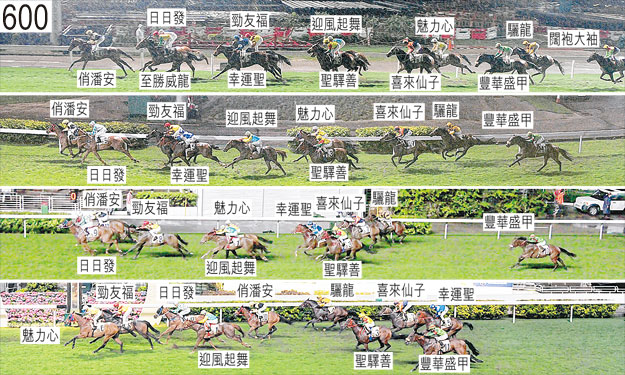「驪龍」自外檔起步後不久在馬群後面切入。何澤堯(「日日發」)承認一項不小心策騎〔賽事規例第100(1)條〕,事緣在首次跑過終點時,他容許坐騎在尚未充分帶離「聖驛善」時向內斜跑,導致該駒勒避並失去應有的跑線。小組判罰何澤堯停賽(兩個香港賽馬日)直至五月三十日星期四才可再次出賽。此項停賽罰則押後至五月二十二日星期三跑馬地賽事後執行。 此外,何澤堯被罰款二萬五千元,以代替停賽多一個賽馬日。跑過二百米處時,「迎風起舞」被「魅力心」(楊明綸)碰撞後失去平衡,當時「魅力心」向外斜跑以望空。小組譴責楊明綸,並告誡他日後在轉換跑線時須更加倍小心。被查詢時,霍勵賢說,由於今仗是「豐華盛甲」首次在跑馬地上陣,他獲指示將該駒置於大約中間位置。他說,覺得倘若「豐華盛甲」在早段一路受催策以佔取前列位置,該駒或未能恰當取得平衡,因而或未能應付跑馬地馬場的賽道。被查詢有關「幸運聖」令人失望的表現時,潘頓說,坐騎沿途走勢僅屬普通,接近六百米處時他須急促向外移出避開「至勝威龍」的後蹄,當時「至勝威龍」開始洩氣潰敗。他說,「幸運聖」繼而在一段短途程上走勢理想,但其後過了五百米處後脫口。他又說,「幸運聖」在直路上受催策時顯著墮退,表現令人失望。賽後獸醫立即檢查「幸運聖」,並無發現任何明顯異常之處。賽後獸醫報告,「日日發」失去左前蹄的蹄鐵。賽後獸醫立即檢查「闊袍大袖」與「至勝威龍」,發現兩駒均心律不正常。「闊袍大袖」與「至勝威龍」均須試閘及格,以及通過獸醫檢驗後,才可再次出賽。「魅力心」及「勁友福」均須接受抽樣檢驗。