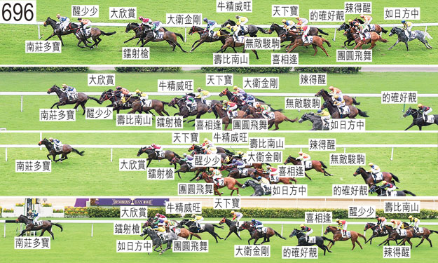 「無敵駿駒」出閘僅屬普通,繼而儘管被一路催策,但未能加速。 「醒少少」起步時被「辣得醒」碰撞,「辣得醒」相應被「壽比南山」碰撞。 接近八百五十米處時,「壽比南山」在外疊競跑,沒有遮擋。 過了六百米處後,「大衛金剛」靠近「鐳射槍」後蹄處於窘境。 被查詢有關「南莊多寶」的進步表現時,練馬師伍碧權說,上仗由貝湯美策騎後,由於「南莊多寶」在佩戴眼罩下跑來過於搶口,貝湯美建議他替該駒除去眼罩。他於是賽前已稍為改變該駒的操練,試圖讓該駒於今仗更放鬆來跑。他說,負輕磅、能夠領放以及除去眼罩均是該駒今仗表現有進的原因。 被查詢時,鄭雨滇說,他收到與上仗策騎「醒少少」時相同的指示,即盡可能將坐騎置於有遮擋的第五或第六位。他說,「醒少少」於上仗抽得比今仗更佳的檔位,而今仗自第十一檔出閘迅速後,他在早段開始與馬群一同向內移入。過了千六米處後,他收慢「醒少少」以圖佔取「大衛金剛」後面有遮擋的位置,但「大衛金剛」於此時亦收慢,他因而未能將坐騎向內移入以取得遮擋。他說,與其繼續在第三疊沒有遮擋下競跑,他選擇在過了千二米處後讓「醒少少」展步上前佔取更靠近內欄但遠較打算為前的位置。賽後獸醫立即檢查「醒少少」,並無發現任何明顯異常之處。 賽後獸醫報告,內窺鏡檢查顯示「大欣賞」的氣管內有很多血。「大欣賞」必須通過獸醫檢驗後,才可再次出賽。 「大衛金剛」、「南莊多寶」以及「如日方中」均須接受抽樣檢驗。