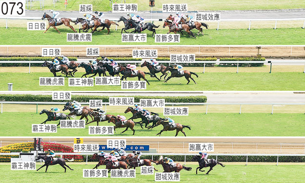 「霸王神駒」出閘緩慢,起步後不久收慢避開「跑贏大市」後蹄,而「跑贏大市」躍出時急促向外斜跑。 儘管在早段被一路猛烈催策,「首飾多寶」未能加速,過了千五米處後收慢及留後以圖取得遮擋。 被查詢有關「跑贏大市」令人失望的表現時,蔡明紹表示,他獲指示讓坐騎在前列嘗試取得遮擋。他說,按照他獲得的策騎指示,過了千二米處後他讓「龍騰虎震」超越「跑贏大市」。其後不久,賽事的步速減慢,接近一千米處時靠近「龍騰虎震」後蹄一度處於窘境後,「跑贏大市」便脫口。接近八百米處時,儘管他一路催策「跑贏大市」,但坐騎未能保持位置,而他亦未能阻止「霸王神駒」移離內欄。他又說,他被迫一路催策「跑贏大市」以繞過「霸王神駒」推進,以避免被帶出更外疊;入直路時,坐騎與「霸王神駒」互相緊迫競跑,當時「霸王神駒」再次向外斜跑以望空。「跑贏大市」大部分途程走勢欠佳,他認為,其表現令人失望。賽後獸醫立即檢查「跑贏大市」,並無發現任何明顯異常之處。 「首飾多寶」、「霸王神駒」以及「時來風送」均須抽取樣本檢驗。