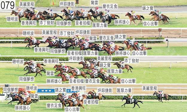 起步後不久,「添丁發財」與「同個夢想」互相碰撞。 接近千一米處時,「勝將雄心」在不願保持在「豐衣足食」與「匯聚力量」之間的位置之際失去平衡及失地。 過了千一米處後,「同個夢想」在難以穩定走勢及靠近「添丁發財」後蹄處於窘境之際昂首。 過了七百米處後轉彎時,「匯聚力量」將頭轉側及外閃。 「豐衣足食」在直路早段受困而未能望空。 「皇者拍檔」(巫斯義)在直路早段外閃。小組再次提醒巫斯義,只要情況許可,他有責任至少手足並用一直力策坐騎至終點。 「驚雷」在直路早段及末段兩度內閃。 賽後獸醫立即檢查「美麗里程」及「匯聚力量」,並無發現任何明顯異常之處。「同個夢想」及「勝將雄心」均須抽取樣本檢驗。