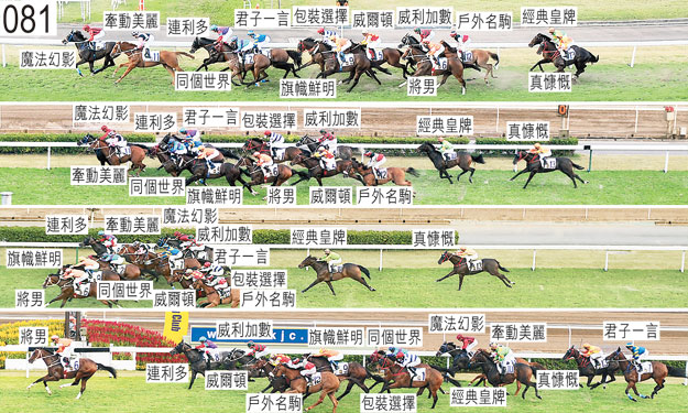 「真慷慨」自大外檔出閘後不久在馬群後面切入。 跑過千三米處時,「旗幟鮮明」收慢避開「牽動美麗」後蹄。 接近千二米處時,「君子一言」在靠近「牽動美麗」後蹄處於窘境之際昂首。 過了七百米處後,「戶外名駒」勒避「將男」後蹄時開始搶口及昂首。 「威利加數」於接近二百五十米處時受困而未能望空。 趨近二百米處時,「君子一言」向內斜跑及在「牽動美麗」後蹄外側處於窘境,當時「牽動美麗」略為向外斜跑。 「連利多」於接近一百五十米處時失去平衡。 「同個世界」沿途在外疊競跑,沒有遮擋。 被查詢有關在最後一百五十米對「經典皇牌」的騎法時,彭利力表示,接近一百五十米處時他須將「經典皇牌」移離向外斜跑的「君子一言」。當他這樣做時,「經典皇牌」向著外側的「包裝選擇」的後蹄斜跑,當時「包裝選擇」亦在催策下略為向內斜跑。因此,他再次停止催策「經典皇牌」。他又說,過了一百米處後,由於他覺得「經典皇牌」將未能跑入更前名次,所以他在末段未有全力催策坐騎。小組告知彭利力,他的解釋會被記入競賽事件報告,而他有責任確保自己以令人無可置疑的方式策騎。 被查詢有關在直路早段對「戶外名駒」的騎法時,梁家俊表示,坐騎跟隨頭馬「將男」上前,走勢良佳。他保持在「將男」後面競跑,以讓「戶外名駒」留力作最後衝刺。當「將男」於三百米處前受全力催策時,他立即開始一路催策坐騎,但「將男」的加速力比「戶外名駒」強勁。他又說,他繼而全力催策坐騎,儘管「戶外名駒」在末段衝刺良佳,他相信坐騎在末段僅能保持位置。小組告誡梁家俊,他須確保自己在適當的時間催策坐騎,以保證坐騎能盡可能跑入最前名次。 被查詢有關「君子一言」令人失望的表現時,潘頓表示,坐騎今季首仗跑1400米取勝時,他相信坐騎憑新鮮感出賽對其有利。坐騎今仗增程至1600米,他不認為坐騎能同樣交出理想表現。他認為,「君子一言」今仗展步未如今季首仗般暢順。賽後獸醫立即檢查「君子一言」,並無發現任何明顯異常之處。 「將男」及「連利多」均須抽取樣本檢驗。
