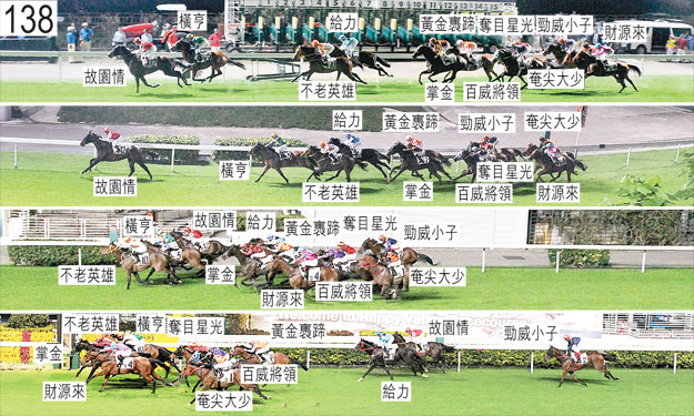 第一場(138) 白樺讓賽 第五班 二二○○米 抵達閘廂後,獸醫報告「雪蹄靈驥」左前腿不良於行,因而不適宜出賽。小組按照獸醫意見,著令「雪蹄靈驥」退出。「雪蹄靈驥」必須通過獸醫檢驗後,才可再次出賽。 「奄尖大少」出閘十分笨拙,起步後不久被「掌金」碰撞時失去平衡,當時「掌金」被「給力」帶向內跑。 「故園情」被起步時向外斜跑的「橫亨」碰撞後隨即將頭轉側,並向外斜跑避開該駒,導致「百威將領」與「財源來」雙雙受阻。其後,自外檔起步的「百威將領」與「財源來」均在馬群後面切入。 「勁威小子」與「奪目星光」起步時互相碰撞。 接近二千米處首次轉彎時,「奄尖大少」在「奪目星光」內側緊迫競跑。 接近千八米處時,「黃金褭蹄」在收慢避開「給力」後蹄之際數度昂首。 同樣在接近千八米處時,「橫亨」失去右後蹄的蹄鐵。 接近千六米處時在一段途程上,「百威將領」與「奄尖大少」互相緊迫競跑。 過了八百米處後在一段途程上,由於「奄尖大少」嘗試自「奪目星光」後面向外移出,而「財源來」被一路催策以保持在「百威將領」後面的位置,該兩駒因而數度互相觸碰。因此,「奄尖大少」與「財源來」數度失去平衡。其後在接近六百五十米處時,由於「奄尖大少」(郭能)嘗試移至「奪目星光」外側,但當時該處空位不足,因而與「財源來」再度互相碰撞及雙雙失去平衡。就此宗事件而言,小組就「奄尖大少」不必要地觸碰「財源來」而譴責郭能,並且告誡他,儘管小組鼓勵具競爭性的騎法,但他必須以不會對其他賽駒構成干擾的方式策騎。 轉直路彎時,「黃金褭蹄」與「掌金」互相緊迫競跑。 在直路早段,「奪目星光」在「掌金」與「百威將領」之間無路可上後受困。「奪目星光」繼而難以望空直至末段,因而未能全力施為。 接近二百米處時,「奄尖大少」在向外斜跑橫越「財源來」後蹄之際一度受妨礙,當時「財源來」在催策下將頭轉側及略為向內斜跑。 儘管小組在宣佈覆磅完畢前並無亮起研訊燈號,但小組觀看了於末段涉及「橫亨」與「不老英雄」的事件的賽事影片。小組發現,「橫亨」在末段在「不老英雄」內側緊迫競跑,當時「不老英雄」將頭轉側及稍微向內斜跑。考慮到該兩駒在最後二百米的相對位置,以及有關事件在接近終點的位置發生,小組決定不進行正式抗議聆訊。儘管「橫亨」的騎師何澤堯沒有對「不老英雄」提出抗議,但這對小組的決定並無影響。 被查詢有關「掌金」的進步表現時,練馬師蘇保羅表示,此駒今仗僅為第二次為其馬房出賽。他說,「掌金」上仗起步時失地甚多,使牠在該仗失去爭勝機會。由於「掌金」在該仗起步時失地的程度,牠必須試閘及格後才可再次出賽,而牠已於十月二十九日試閘及格。他說,他認為此駒於該次試閘中表現僅屬一般。他又說,他能為此駒於是賽的進步表現提供的唯一原因是,由於「掌金」是一匹均速馬,今仗首次增程角逐2200米途程,對其有利。但「掌金」是晚勝出實屬意料之外。 賽後獸醫立即檢查「勁威小子」,並無發現任何明顯異常之處。 「奪目星光」、「掌金」以及「財源來」均須抽取樣本檢驗。