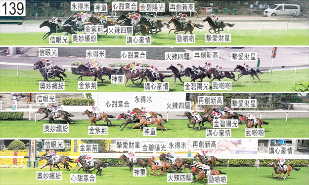 「金紫荊」起步時向外斜跑,導致「摯愛財星」被帶向外跑壓向「勁啲啲」。「火辣四驅」起步時在「神童」與「永得米」之間受擠迫,當時「永得米」向外斜跑。田泰安(「金紫荊」)承認一項不小心策騎〔賽事規例第100(1)條〕,事緣在過了八百米處後,他容許坐騎在尚未帶離「神童」時向內斜跑,導致「神童」被帶向內跑橫越「火辣四驅」應有的跑線,「火辣四驅」因而須勒避及失去應有的跑線。在此宗事件中,「心甜意合」被「火辣四驅」碰撞後軀時失去平衡。小組判罰田泰安停賽(三個香港賽馬日)直至十二月五日星期四才可再次出賽。此項停賽罰則押後至十一月二十四日星期日沙田賽事後執行。接近七百米處時,「神童」在「金紫荊」內側受擠迫時受阻,當時「金紫荊」被「奧妙繽紛」帶向內跑,而「奧妙繽紛」則相應被「信眼光」(安國倫)帶向內跑。小組譴責安國倫,並且告誡他日後在轉換跑線時須確保已充分帶離他駒。同樣在接近七百米處時,「神童」失去右後蹄的蹄鐵。接近四百五十米處時,「再創新高」被「勁啲啲」碰撞後軀後失去平衡,當時「勁啲啲」在靠近「火辣四驅」後蹄處於窘境之際向內斜跑。進入直路時,「心甜意合」與「神童」緊迫競跑。跑過三百米處時,「金碧陽光」移至「火辣四驅」內側以望空。賽後獸醫立即檢查「金碧陽光」,並無發現任何明顯異常之處。「奧妙繽紛」與「信眼光」均須抽取樣本檢驗。