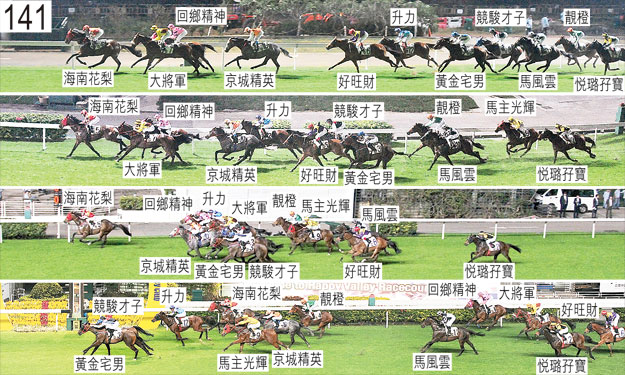 起步時被「回鄉精神」碰撞後,「海南花梨」隨即向內斜跑,導致「悅璐孖寶」失去平衡及向內斜跑,「競駿才子」及「黃金宅男」因而受擠迫,當時「黃金宅男」被帶向內跑壓向「好旺財」的後軀,「好旺財」因而失去平衡。 「馬主光輝」自大外檔出閘後不久在馬群後面切入。 接近千三米處時,「競駿才子」在「馬風雲」內側緊迫競跑,當時「馬風雲」被「黃金宅男」帶向內跑,「黃金宅男」則將頭轉側及一度向內斜跑,「黃金宅男」繼而向外移出以紓緩緊迫情況。 跑過千三米處時,「升力」將頭轉側及向外斜跑橫越「京城精英」的後蹄。「升力」繼而開始十分難以穩定走勢,在勒避「京城精英」的後蹄時數度昂首。 跑過千一米處時,「馬風雲」收慢避開「黃金宅男」後蹄,當時「黃金宅男」向內斜跑。 接近一千米處時,「回鄉精神」一度在「海南花梨」內側緊迫競跑,當時「海南花梨」稍微向內斜跑。 進入直路時,開始墮退的「好旺財」向外斜跑,碰撞「黃金宅男」,「黃金宅男」因而失去平衡。跑了一段短途程後,「好旺財」在「黃金宅男」(莫雷拉)與「競駿才子」(潘頓)之間受擠迫時勒避,當時「黃金宅男」因這次觸碰而將頭轉側及向內斜跑,而「競駿才子」則移至「京城精英」後蹄外側以望空。由於小組認為此宗事件源自「好旺財」向外斜跑及與「黃金宅男」互相觸碰,隨後「黃金宅男」及「競駿才子」雙雙斜跑,因此除了告誡莫雷拉及潘頓在類似情況下須加倍小心外,小組不採取進一步行動。跟隨在後的「馬風雲」因而受阻及向內斜跑避開「好旺財」後蹄。在此宗事件中,「競駿才子」及「黃金宅男」均失去平衡。 跑過三百米處時,「升力」在「回鄉精神」與「大將軍」之間無路可上後移至「回鄉精神」內側。 跑過二百米處時,「靚橙」向外移出避開「回鄉精神」後蹄。 直路上,「馬主光輝」內閃,難以催策。 被查詢時,莫雷拉(「黃金宅男」)表示,直路上他用鞭力策坐騎直至趨近五十米處。他說,當時他注意到「競駿才子」在其內側,正在爭奪冠軍,由於他認為「黃金宅男」在鞭策下已盡全力,他選擇停止鞭策,轉而猛烈地手足並用力策坐騎至終點。他說,他持續推策坐騎至終點,並盡其所能力策坐騎。他又說,他認為在有關情況下,他在最後階段放棄用鞭,轉而手足並用力策坐騎是對牠最有利的做法。 「黃金宅男」及「競駿才子」均須抽取樣本檢驗。