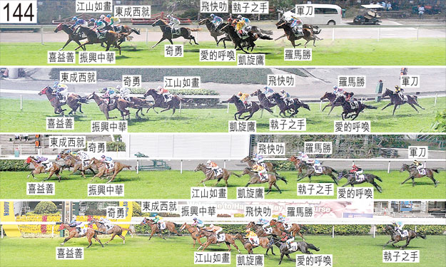 「飛快叻」起步時被「軍刀」碰撞,當時「軍刀」向外斜跑。 起步後不久,出閘緩慢的「執子之手」在「羅馬勝」與「東成西就」之間受擠迫時勒避,當時「東成西就」向外斜跑。 過了三百米處後,「奇勇」在「喜益善」後蹄內側處於窘境時一度受妨礙,當時「喜益善」向內斜跑。 趨近一百米處時,「東成西就」一度在「奇勇」內側緊迫競跑,當時「奇勇」在直路上於催策下將頭轉側及內閃。 小組就湯智傑策騎「愛的呼喚」的方法,尤其是在過了四百米處後的騎法展開研訊。聽取了湯智傑、練馬師方嘉柏馬房的助理練馬師鍾智強以及方嘉柏的私人助理Ms F Fownes的證供,小組將研訊押後另訂日期進行。 賽後獸醫立即檢查「軍刀」及「愛的呼喚」,並無發現任何明顯異常之處。 「喜益善」及「奇勇」均須抽取樣本檢驗。