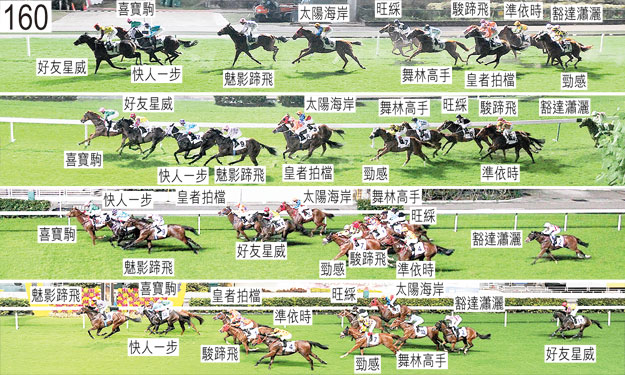 「駿蹄飛」與「勁感」均出閘緩慢。 「準依時」出閘十分笨拙,出閘後不久向內斜跑及觸碰「魅影蹄飛」,「魅影蹄飛」相應向內斜跑及觸碰「旺綵」。「準依時」繼而未能加速,一千一百五十米處收慢避開「舞林高手」後蹄。 出閘後在一段短途程上,「舞林高手」收慢避開「喜寶駒」後蹄,當時「喜寶駒」向內斜跑。 儘管在早段被一路催策,「旺綵」未能加速。 「魅影蹄飛」配戴的鼻帶在賽事途中斷開,該項配備因而在直路上鬆脫。賽後獸醫立即檢查「勁感」,內窺鏡檢查顯示該駒的氣管內有很多血。「勁感」必須通過獸醫檢驗後,才可再次出賽。「喜寶駒」、「魅影蹄飛」以及「快人一步」均須抽取樣本檢驗。