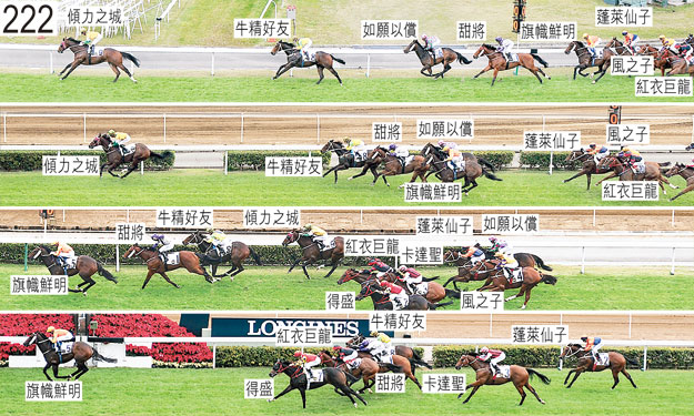 「牛精好友」出閘笨拙。 「得盛」與「喜競寶寶」自外檔出閘後不久均在馬群後面切入。 過了千二米處後,由於「紅衣巨龍」嘗試向內移入,因而與「風之子」緊迫競跑。其後趨近千一米處時,「紅衣巨龍」與「風之子」互相觸碰後失去平衡。 「紅衣巨龍」沿途在外疊競跑,沒有遮擋。 被查詢時,梁家俊表示,由於「傾力之城」跑此途程慣常領放,因此他獲指示讓「傾力之城」帶頭。他說,賽前預期「牛精好友」亦會在早段居前列競跑,而他應利用排第一檔的優勢,盡可能在該駒內側保持領先。他按照指示於入閘前在閘後讓「傾力之城」充分熱身。開閘時,「傾力之城」失蹄,出閘僅屬一般。他繼而須在早段一路催策「傾力之城」以彌補出閘緩慢的不足。他又說,「傾力之城」跑了數步後才能取得平衡並展現前速,直至跑過千二米處時他才能取得領先。取得領先後,他嘗試減慢「傾力之城」的步速,但近期均跑1200米賽事的坐騎立即難以穩定走勢,儘管他嘗試讓坐騎放鬆來跑,但坐騎未能做到。過了一千米處後「傾力之城」開始特別難以穩定走勢,他未能阻止坐騎拉開與餘駒的距離。小組告誡梁家俊,儘管小組接納他在早段須消耗坐騎不少氣力以按照指示取得領先,但他必須盡可能確保適當地分配段速,讓坐騎在末段能夠有十足機會以勁勢衝刺。 被查詢時,蔡明紹(「蓬萊仙子」)表示,他獲指示盡可能將坐騎置於領放馬匹後面的第三或第四位。然而,「蓬萊仙子」一如上仗般未能出閘迅速,因此他選擇將坐騎在馬群後面切入以取得有遮擋的位置,而非一路催策坐騎。考慮到「蓬萊仙子」是日出閘的情況,他覺得將須消耗坐騎很多氣力才能按照指示佔取前列位置。「蓬萊仙子」的練馬師告東尼證實,他打算是日讓該駒居於領放馬後面。他說,賽前預期「傾力之城」會領放,而「牛精好友」會居於其外側,並期望「蓬萊仙子」可以跟隨該兩駒競跑。他又說,「蓬萊仙子」未能出閘迅速,似乎未有早前部分賽事般的前速。他說,他一向打算讓該駒在陣上盡可能居前列競跑。 「旗幟鮮明」及「得盛」均須抽取樣本檢驗。